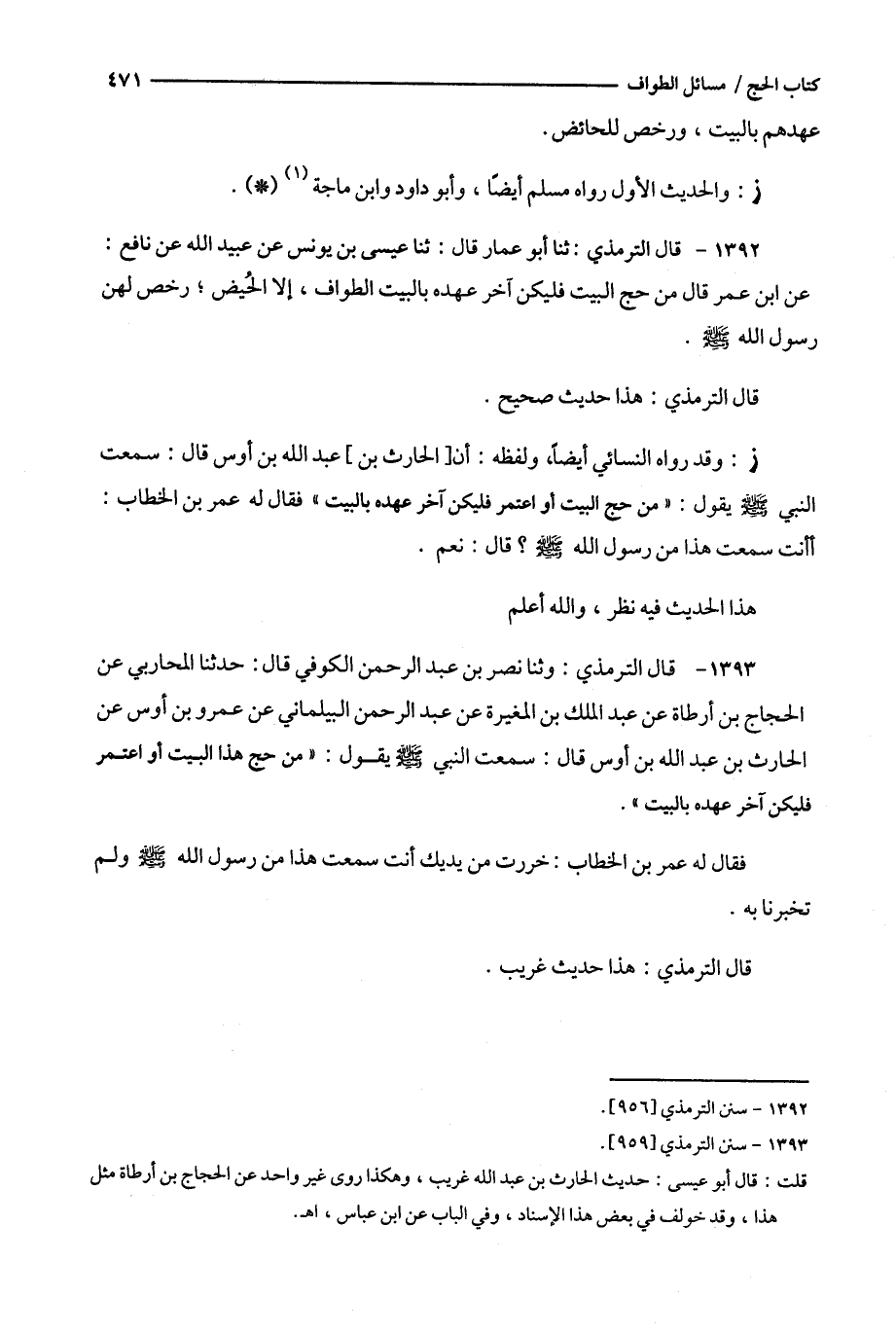 1392 - قال الترمذي : ثنا أبو عمار قال : ثنا عيسى بن يونس عن عبيد الله عن نافع : عن ابن عمر قال من حج البيت فليكن آخر عهده بالبيت الطواف ، إلا الحيض ؛ رخص لهن رسول الله .