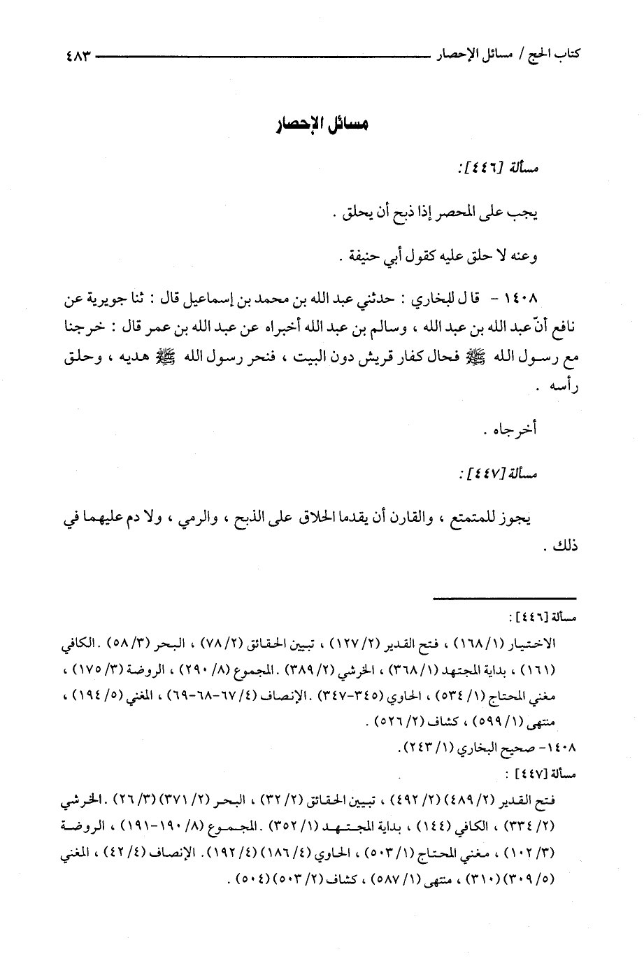 1408 - قال للبخاري : حدثني عبد الله بن محمد بن إسماعيل قال : ثنا جويرية عن نافع أن عبد الله بن عبد الله ، وسالم بن عبد الله أخبراه عن عبد الله بن عمر قال : خرجنا مع رسول الله فحال كفار قريش دون البيت ، فنحر رسول الله هديه ، وحلق رأسه .