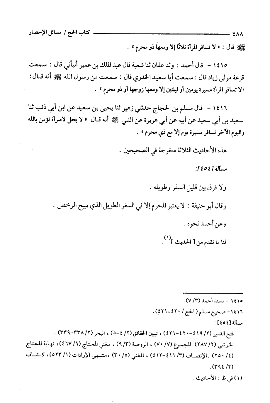 1416 - قال مسلم بن الحجاج حدثني زهير ثنا يحيى بن سعيد عن ابن أبي ذئب ثنا سعيد بن أبي سعيد عن أبيه عن أبي هريرة عن النبي أنه قال ' لا يحل لامرأة تؤمن بالله واليوم الآخر تسافر مسيرة يوم إلا مع ذي محرم ' .