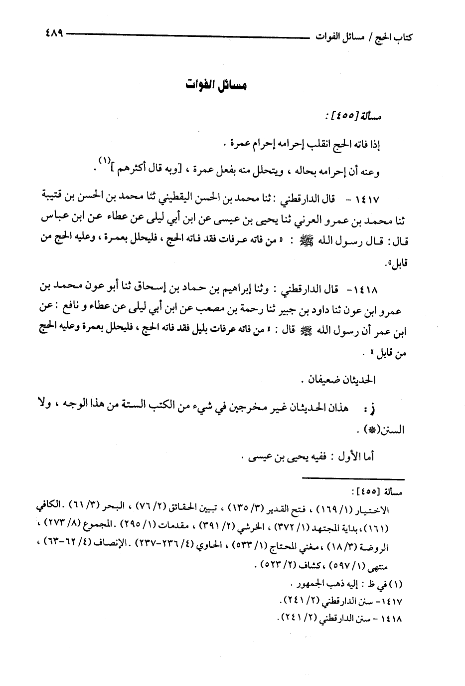 1417 - قال الدارقطني : ثنا محمد بن الحسن اليقطيني ثنا محمد بن الحسن بن قتيبة ثنا محمد بن عمرو العرني ثنا يحي بن عيسى عن ابن أبي ليلى عن عطاء عن ابن عباس قال : قال رسول الله : ' من فاته عرفات فقد فاته الحج ، فليحلل بعمرة ، وعليه الحج من قابل ' .