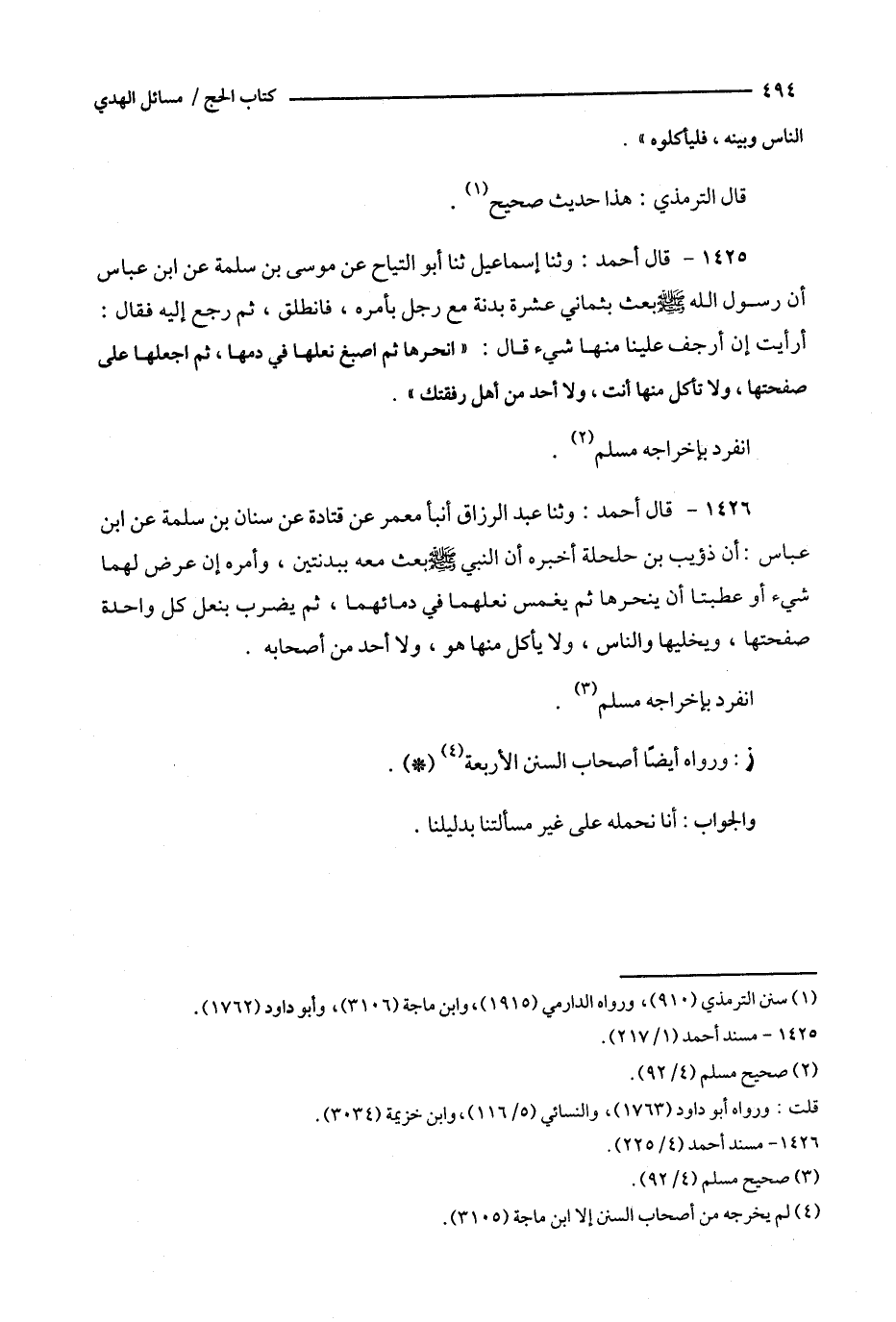 1426 - قال أحمد : وثنا عبد الرزاق أنبأ معمر عن قتادة عن سنان بن سلمة عن ابن عباس : أن ذؤيب بن حلحلة أخبره أن النبي بعث معه ببدنتين ، وأمره إن عرض لهما شيء أو عطبتا أن ينحرها ثم يغمس نعلهما في دمائهما ، ثم يضرب بنعل كل واحدة صفحتها ، ويخليها والناس ، ولا يأكل منها هو ، ولا أحد من أصحابه .