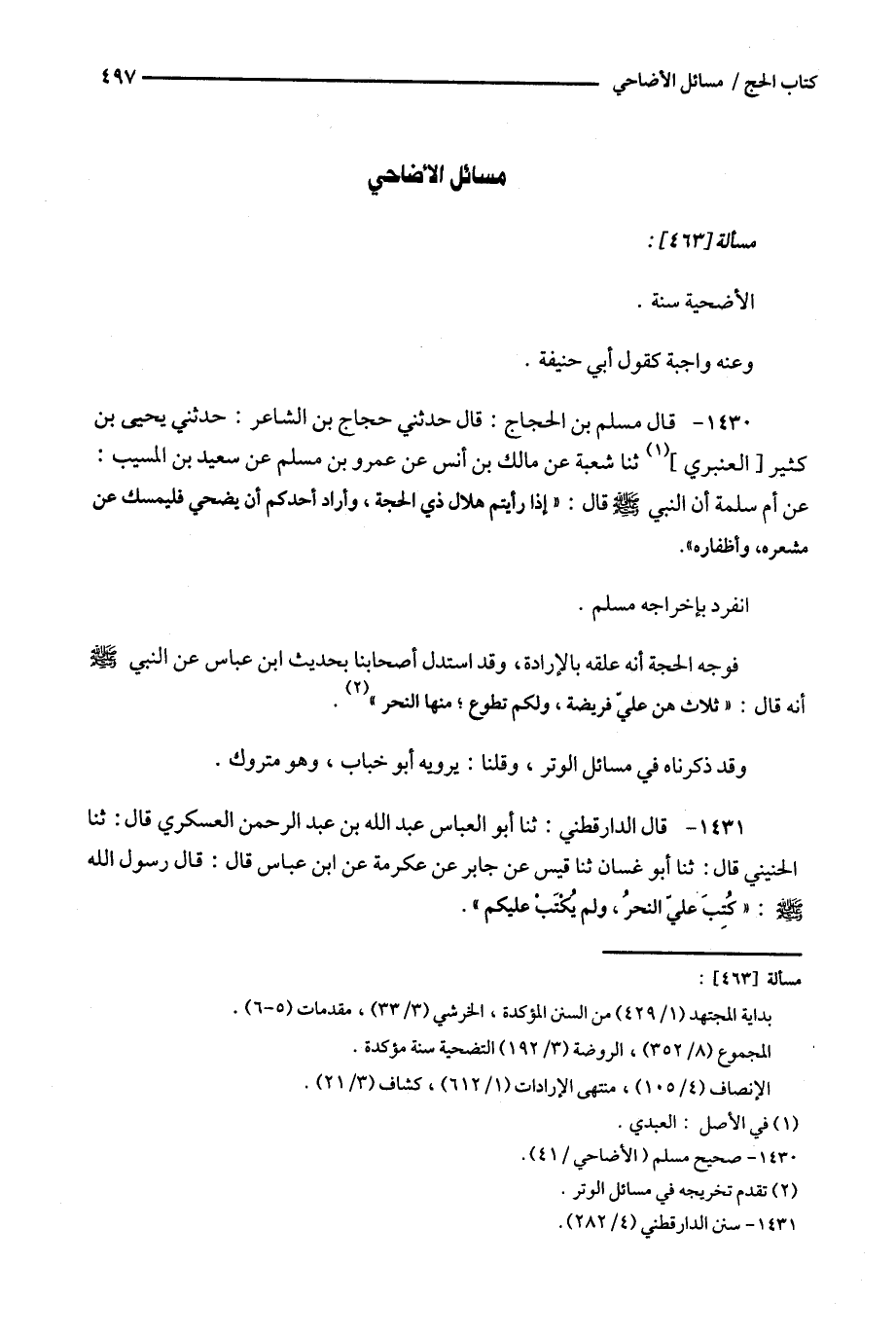 1430 - قال مسلم بن الحجاج : قال حدثني حجاج بن الشاعر : حدثني يحي بن كثير [ العنبري ] ثنا شعبة عن مالك بن أنس عن عمرو بن مسلم عن سعيد بن المسيب : عن أم سلمة أن النبي قال : ' إذا رأيتم هلال ذي الحجة ، وأراد أحدكم أن يضحي فليمسك عن مشعره وأظفاره ' .
