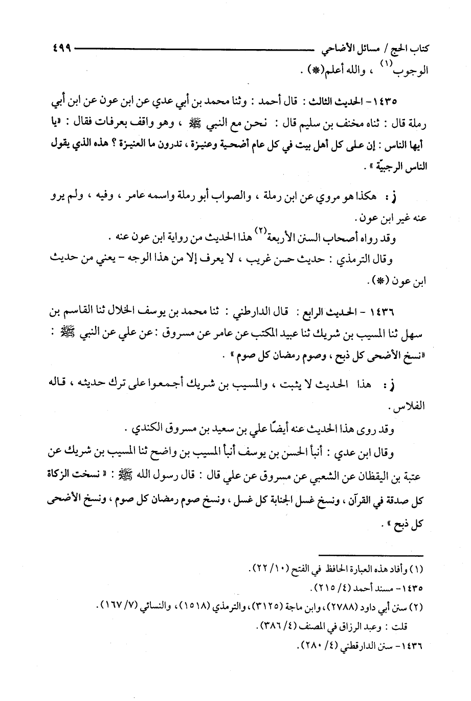 1436 - الحديث الرابع : قال الدارقطني : ثنا محمد بن يوسف الخلال ثنا القاسم بن سهل ثنا المسيب بن شريك ثنا عبيد المكتب عن عامر عن مسروق : عن علي عن النبي : ' نسخ الأضحى كل ذبح ، وصوم رمضان كل صوم ' .
