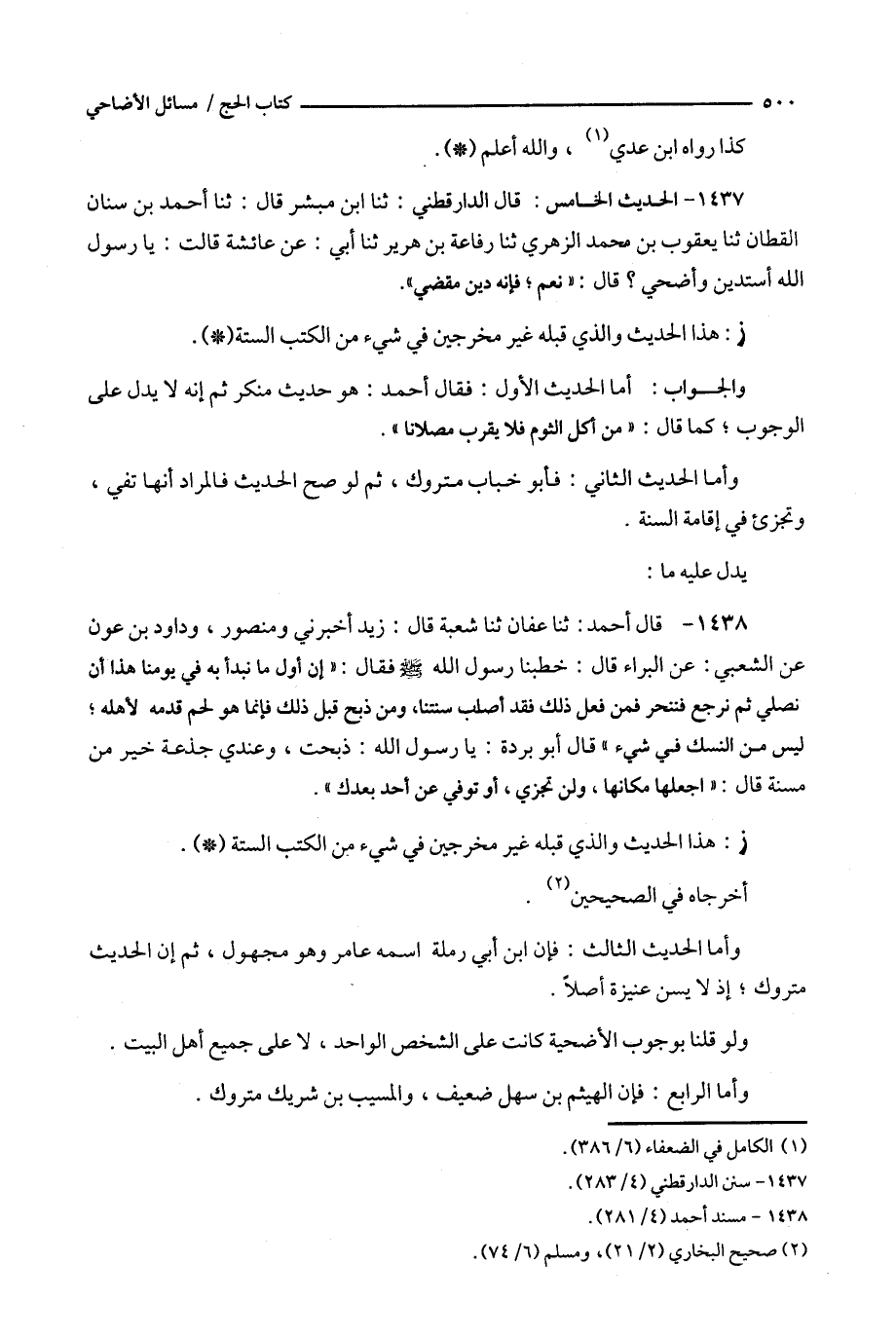 1437 - الحديث الخامس : قال الدارقطني : ثنا ابن مبشر قال : ثنا أحمد بن سنان القطان ثنا يعقوب بن محمد الزهري ثنا رفاعة بن هرير ثنا أبي : عن عائشة قالت : يا رسول الله أستدين وأضحي ؟ قال : لا نعم ؛ فإنه دين مقضي ' .