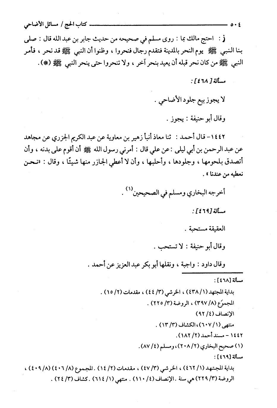 ز : احتج مالك بما : روى مسلم في صحيحه من حديث جابر بن عبد الله قال : صلى بنا النبي يوم النحر بالمدينة فتقدم رجال فنحروا ، وظنوا أن النبي قد نحر ، فأمر النبي من كان نحر قبله أن يعيد بنحر آخر ، ولا تنحروا حتى ينحر النبي .