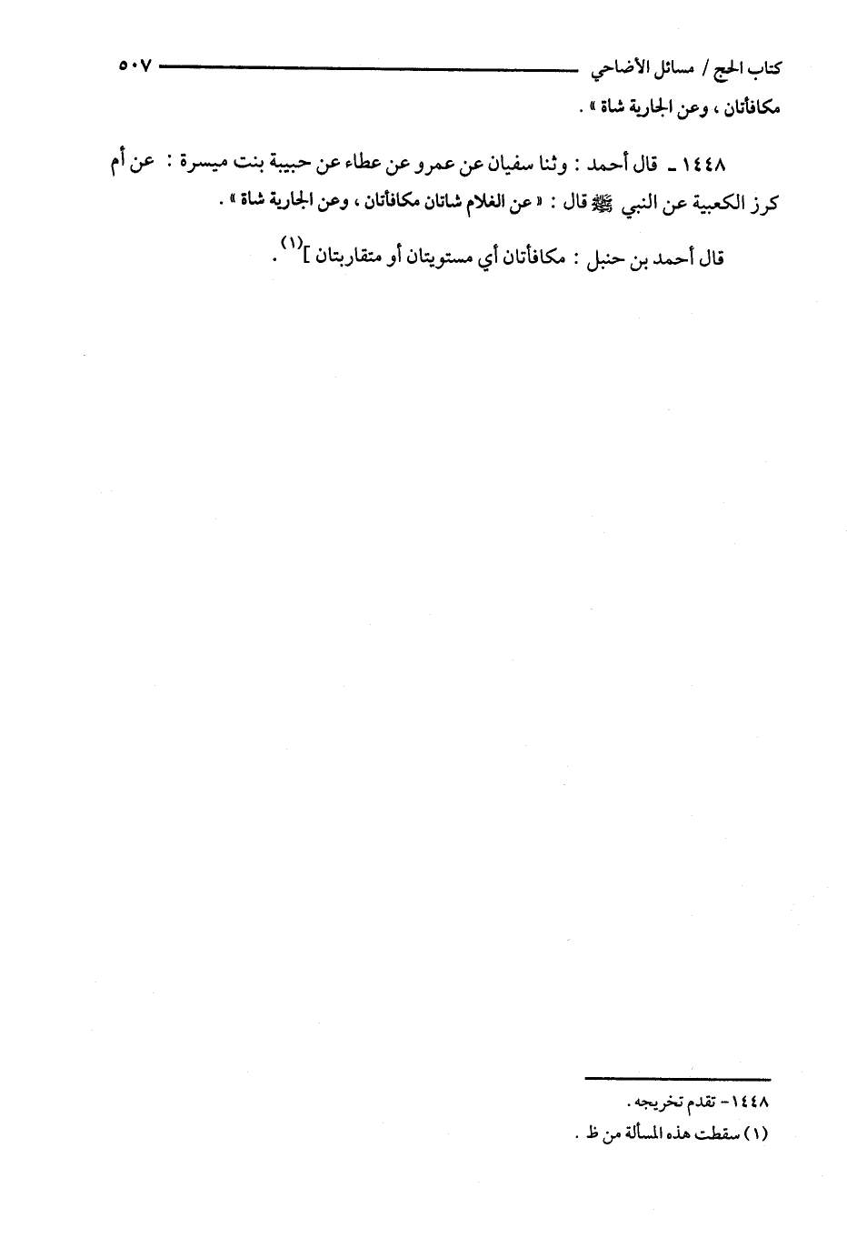 1448 - قال أحمد : وثنا سفيان عن عمرو عن عطاء عن حبيبة بنت ميسرة : عن أم كرز الكعبية عن النبي قال : ' عن الغلام شاتان مكافأتان ، وعن الجارية شاة ' .