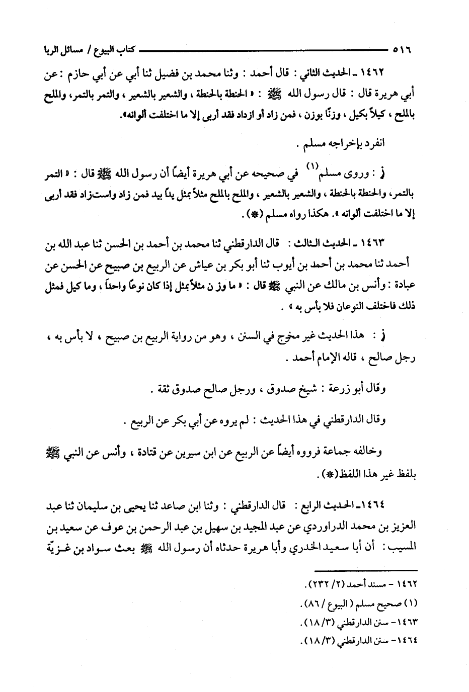 ز : وروى مسلم في صحيحه عن أبي هريرة أيضا أن رسول الله قال : ' التمر بالتمر ، والحنطة بالحنطة ، والشعير بالشعير ، والملح بالملح مثلا بمثل يدا بيد فمن زاد واستزاد فقد أربى إلا ما اختلفت ألوانه ' .