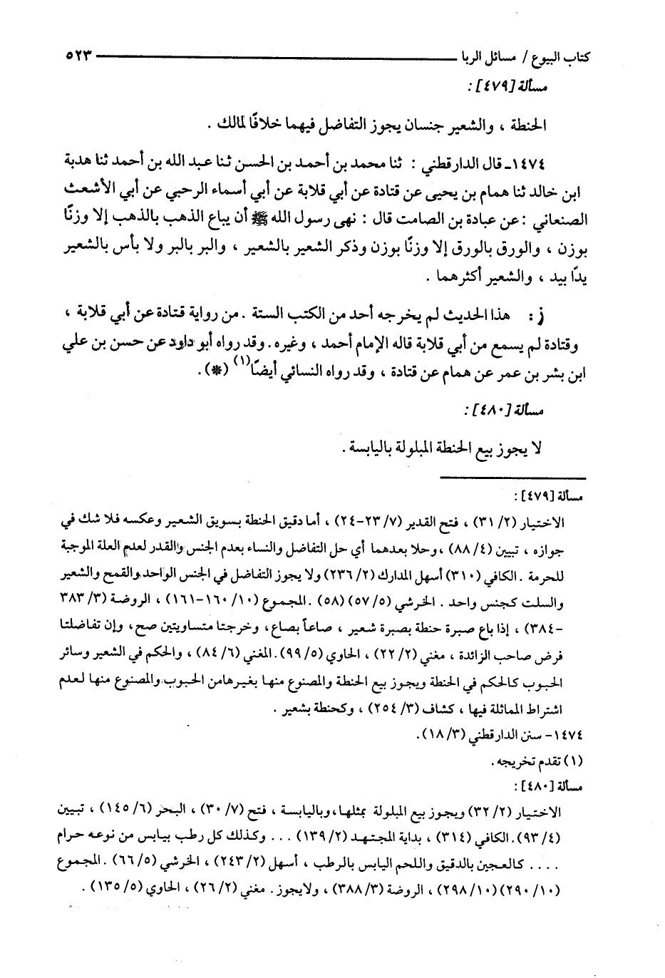 1474 - قال الدارقطني : ثنا محمد بن أحمد بن الحسن ثنا عبد الله بن أحمد ثنا هدبة ابن خالد ثنا همام بن يحي عن قتادة عن أبي قلابة عن أبي أسماء الرحبي عن أبي الأشعث الصنعاني : عن عبادة بن الصامت قال : نهى رسول الله أن يباع الذهب بالذهب إلا وزنا بوزن ، والورق بالورق إلا وزنا بوزن وذكر الشعير بالشعير ، والبر بالبر ولا بأس بالشعير يدا بيد ، والشعير أكثرهما .