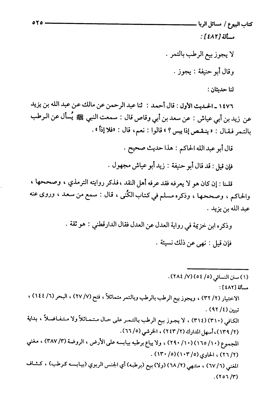 1476 - الحديث الأول : قال أحمد : ثنا عبد الرحمن عن مالك عن عبد الله بن يزيد عن زيد بن أبي عياش : عن سعد بن أبي وقاص قال : سمعت النبي يسأل عن الرطب بالتمر فقال : ' ينقص إذا يبس ؟ ' قالوا : نعم ، قال : ' فلا إذا ' .