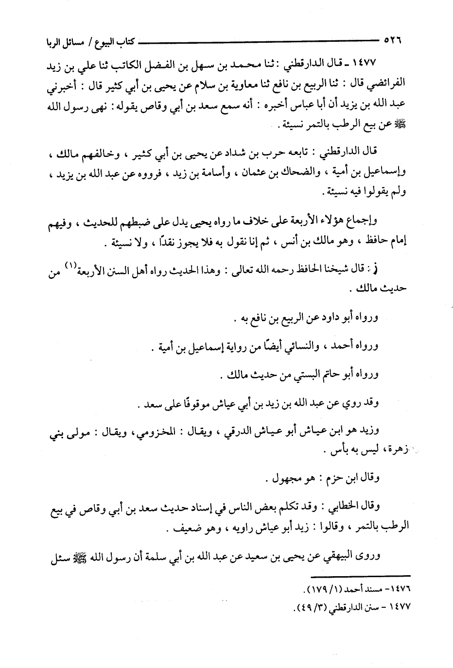1477 - قال الدارقطني : ثنا محمد بن سهل بن الفضل الكاتب ثنا علي بن زيد الفرائضي قال : ثنا الربيع بن نافع ثنا معاوية بن سلام عن يحيى بن أبي كثير قال : أخبرني عبد الله بن يزيد أن أبا عباس أخبره : أنه سمع سعد بن أبي وقاص يقوله : نهى رسول الله عن بيع الرطب بالتمر نسيئة .