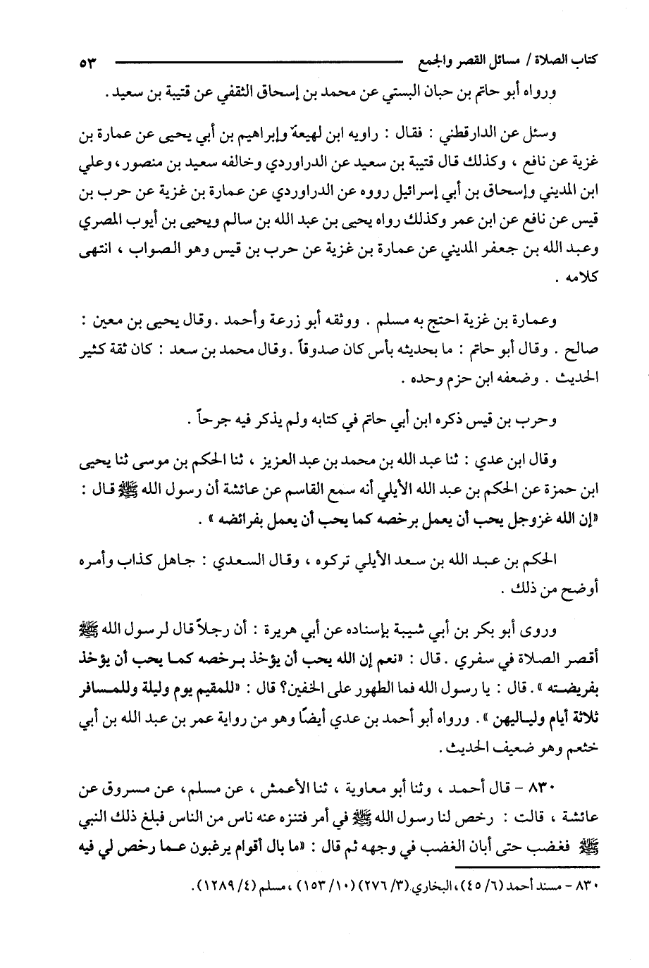 وسئل عن الدارقطني : فقال : راويه ابن لهيعة وإبراهيم بن أبي يحي عن عمارة بن غزيه عن نافع ، وكذلك قال قتيبة بن سعيد عن الدراوردي وخالفه سعيد بن منصور ، وعلي ابن المديني وإسحاق بن أبي إسرائيل رووه عن الدراوردي عن عمارة بن غزية عن حرب بن قيس عن نافع عن ابن عمر وكذلك رواه يحي بن عبد الله بن سالم ويحي بن أيوب المصري وعبد الله بن جعفر المديني عن عمارة بن غزية عن حرب بن قيس وهو الصواب ، انتهى كلامه .