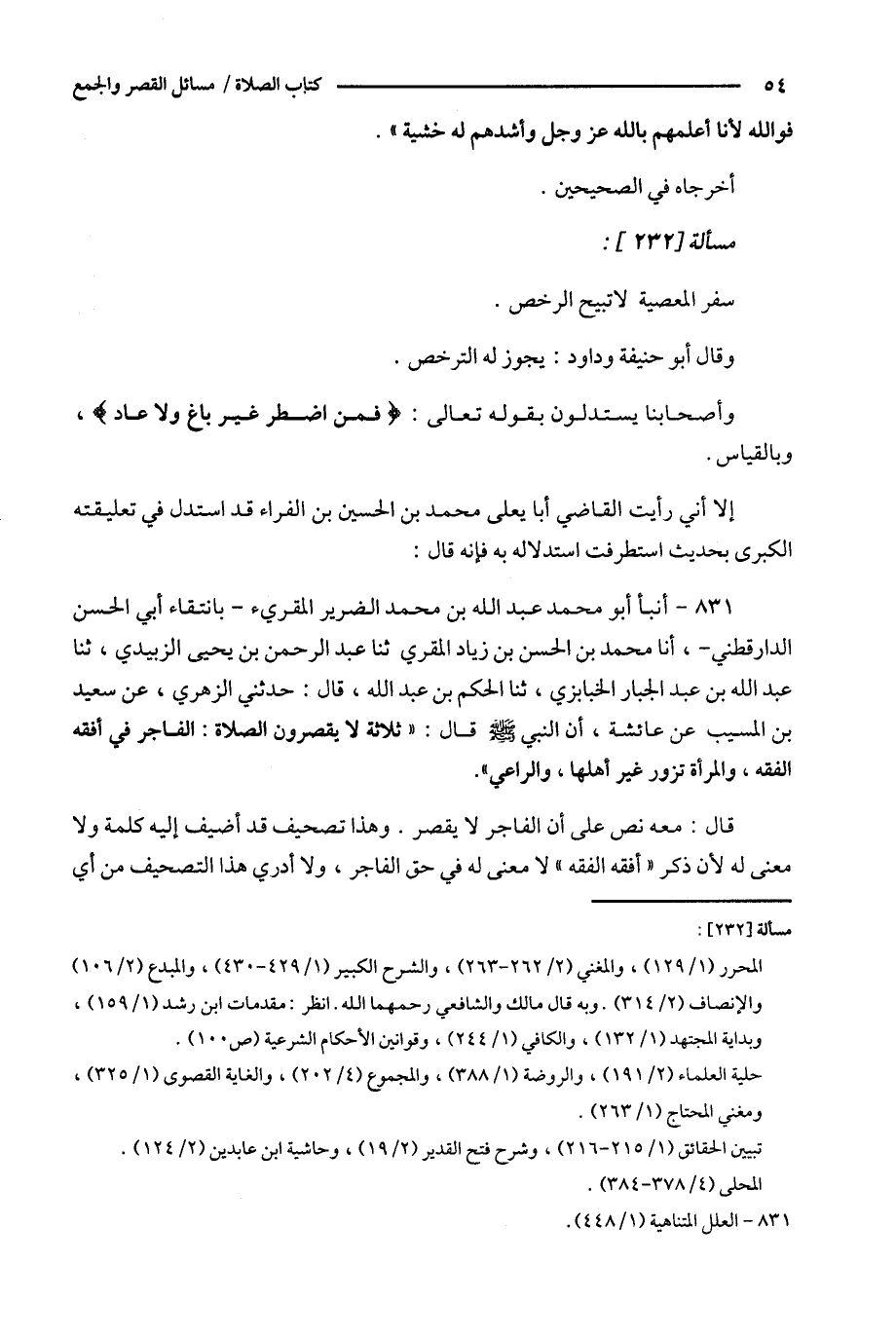 831 - أنبأ أبو محمد عبد الله بن محمد الضرير المقرىء - بانتقاء أبي الحسن الدارقطني - ، أنا محمد بن الحسن بن زياد المقري ثنا عبد الرحمن بن يحي الزبيدي ، ثنا عبد الله بن عبد الجبار الخبابزي ، ثنا الحكم بن عبد الله ، قال : حدثني الزهري ، عن سعيد بن المسيب عن عائشة ، أن النبي قال : ' ثلاثة لا يقصرون الصلاة : الفاجر في أفقه الفقه ، والمرأة تزور غير أهلها ، والراعي ' . قال : معه نص على أن الفاجر لا يقصر .