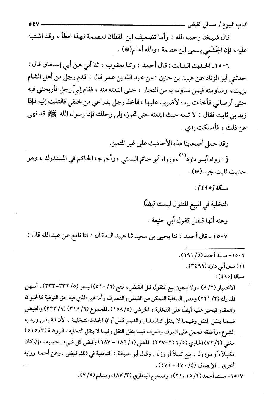 1506 - الحديث الثالث : قال أ حمد : وثنا يعقوب ، ثنا أبي عن أبي إسحاق قال : حدثني أبو الزناد عن عبيد بن حنين : عن عبد الله بن عمر قال : قدم رجل من أهل الشام بزيت ، وساومته فيمن ساومه به من التجار ، حتى ابتعته منه ، فقام إلي رجل فأربحني فيه حتى أرضاني فأخذت بيده لأضرب عليها ، فأخذ رجل بذراعي من خلفي فالتفت إليه فإذا زيد بن ثابت فقال : لا تبعه حيث ابتعته حتى تحوزه إلى رحلك فإن رسول الله قد نهى عن ذلك ، فأمسكت يدي .