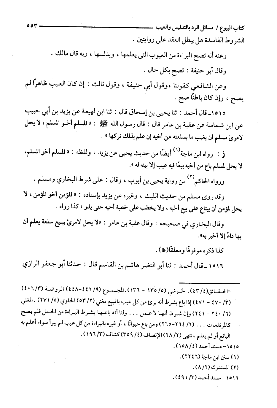 1515 - قال أحمد : ثنا يحيى بن إسحاق قال : ثنا ابن لهيعة عن يزيد بن أبي حبيب عن ابن شماسة عن عقبة بن عامر قال : قال رسول الله : ' المسلم أخو المسلم ، لا يحل لامرىء مسلم أن يغيب ما بسلعته عن أخيه إن علم بذلك تركها ' .