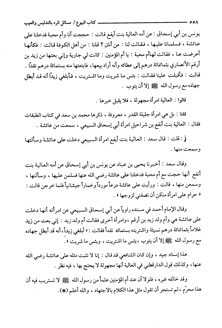 وقال الإمام أحمد في مسنده راويا عن أبي إسحاق السبيعي عن امرأته أنها دخلت على عائشة هي وأم ولد زيد بن أرقم ، وامرأة أخرى فقالت أم ولد زيد : إني بعت من زيد غلاما بثمانمائة درهم نسيئة واشتريته بستمائة نقدا فقالت : ' أبلغي زيدا ، أنه قد أبطل جهاده مع رسول الله إلا أن يتوب ، بئس ما اشتريت ، وبئس ما شريت ' .