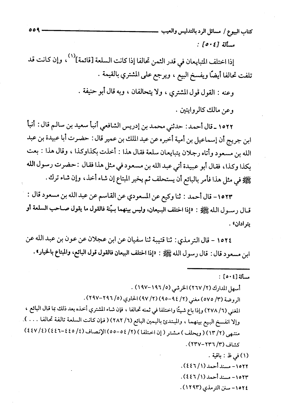1522 - قال أحمد : حدثني محمد بن إدريس الشافعي أنبأ سعيد بن سالم قال : أنبأ ابن جريج أن إسماعيل بن أمية أخبره عن عبد الملك بن عمير قال : حضرت أبا عبيدة بن عبد الله بن مسعود وأتاه رجلان يتبايعان سلعة فقال هذا : أخذت بكذا وكذا ، وقال هذا : بعت بكذا وكذا ، فقال أبو عبيدة أتي عبد الله بن مسعود في مثل هذا فقال : حضرت رسول الله في مثل هذا فأمر بالبائع أن يستخلف ثم يخير المبتاع إن شاء أخذ ، وإن شاء ترك .