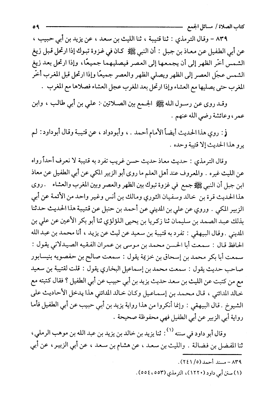 839 - وقال الترمذي : ثنا قتيبة ، ثنا الليث بن سعد ، عن يزيد بن أبي حبيب ، عن أبي الطفيل عن معاذ بن جبل : أن النبي كان في غزوة تبوك إذا ارتحل قبل زيغ الشمس آخر الظهر إلى أن يجمعها إلى العصر فيصليهما جميعا ، وإذا ارتحل بعد زيغ الشمس عجل العصر إلى الظهر ويصلي الظهر والعصر جميعا وإذا ارتحل قبل المغرب أخر المغرب حتى يصليها مع العشاء وإذا ارتحل بعد المغرب عجل العشاء فصلاها مع المغرب .