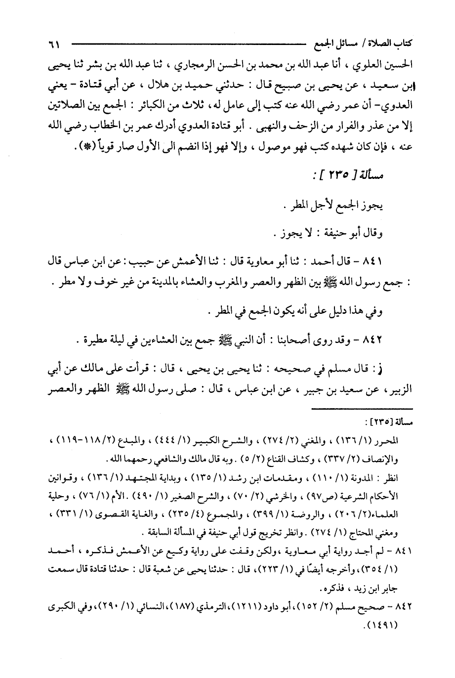 842 - وقد روى أصحابنا : أن النبي جمع بين العشاءين في ليلة مطيرة .