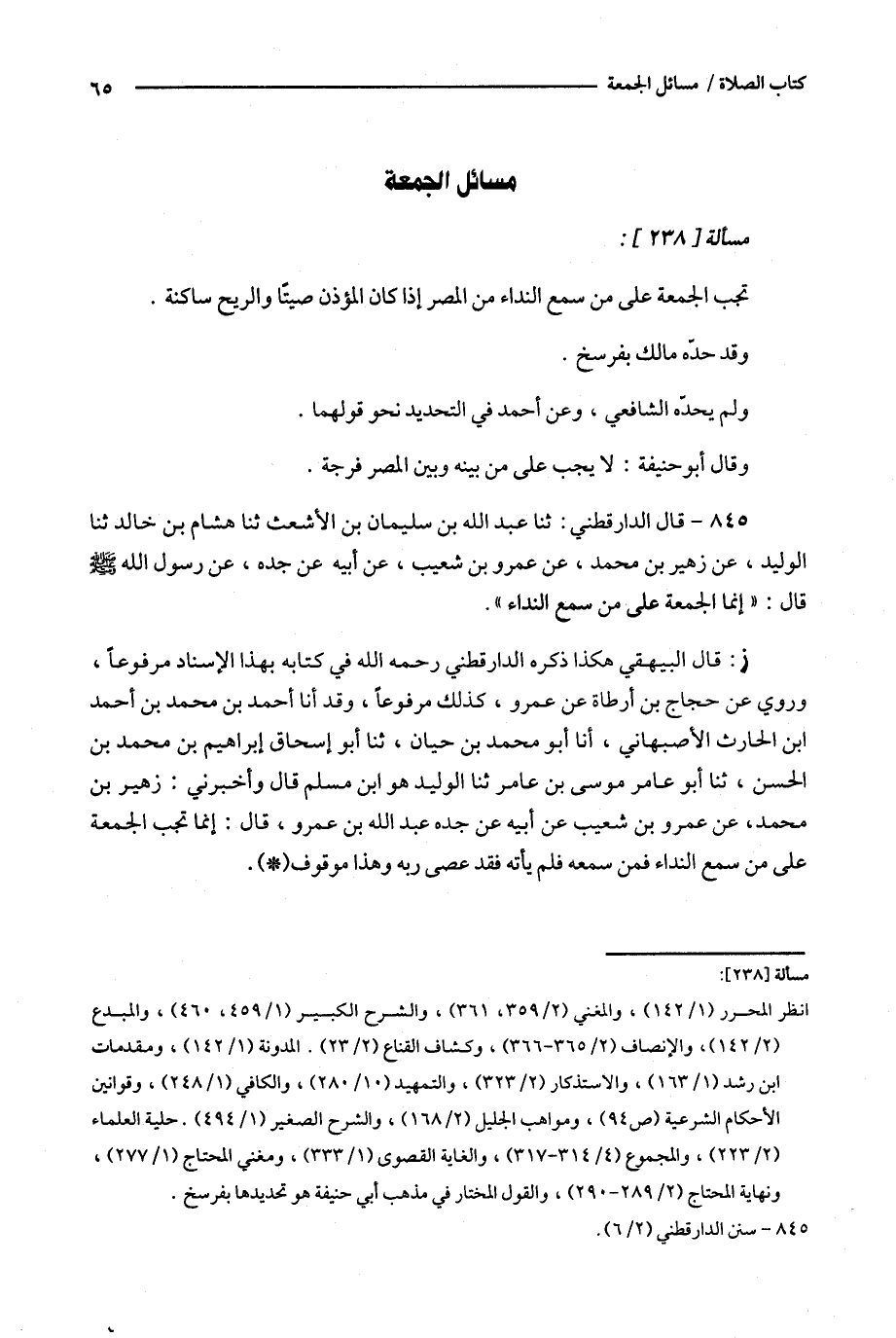 ز : قال البيهقي هكذا ذكره الدارقطني رحمه الله في كتابه بهذا الإسناد مرفوعا ، وروي عن حجاج بن أرطأة عن عمرو ، كذلك مرفوعا ، وقد أنا أحمد بن محمد بن أحمد ابن الحارث الأصبهاني ، أنا أبو محمد بن حيان ، ثنا أبو إسحاق إبراهيم بن محمد بن الحسن ، ثنا أبو عامر موسى بن عامر ثنا الوليد هو ابن مسلم قال وأخبرني : زهير بن محمد ، عن عمرو بن شعيب عن أبيه عن جده عبد الله بن عمرو ، قال : إنما تجب الجمعة على من سمع النداء فمن سمعه فلم يأته فقد عصى ربه وهذا موقوف .