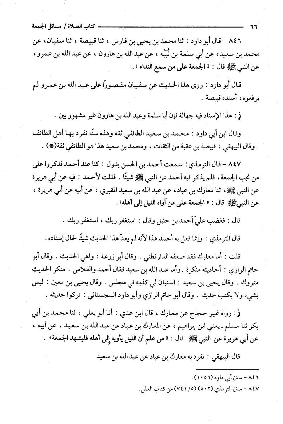 فقلت لأحمد : فيه عن أبي هريرة عن النبي ، ثنا معارك بن عباد ، عن عبد الله بن سعيد المقبري ، عن أبيه عن أبي هريرة عن النبي قال : ' الجمعة على من آواه الليل إلى أهله ' .