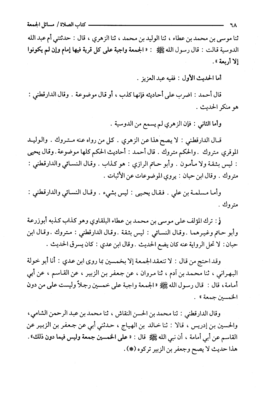 وقد احتج من قال : لا تنعقد الجمعة إلا بخمسين بما روى ابن عدي : أنا أبو خولة البهراني ، ثنا محمد بن آدم ، ثنا مروان / عن جعفر بن الزبير ، عن القاسم ، عن أبي أمامة ، قال : قال رسول الله ' الجمعة واجبة على خمسين رجلا وليست على من دون الخمسين جمعة ' . وقال الدارقطني : ثنا محمد بن الحسن النقاش ، ثنا محمد بن عبد الرحمن الشامي ن والحسين بن إدريس ، قالا : ثنا خالد بن الهياج ، حدثني أبي عن جعفر بن الزبير عن القاسم عن أبي أمامة ، أن نبي الله قال : ' على الخمسين جمعة وليس فيما دون ذلك ' .