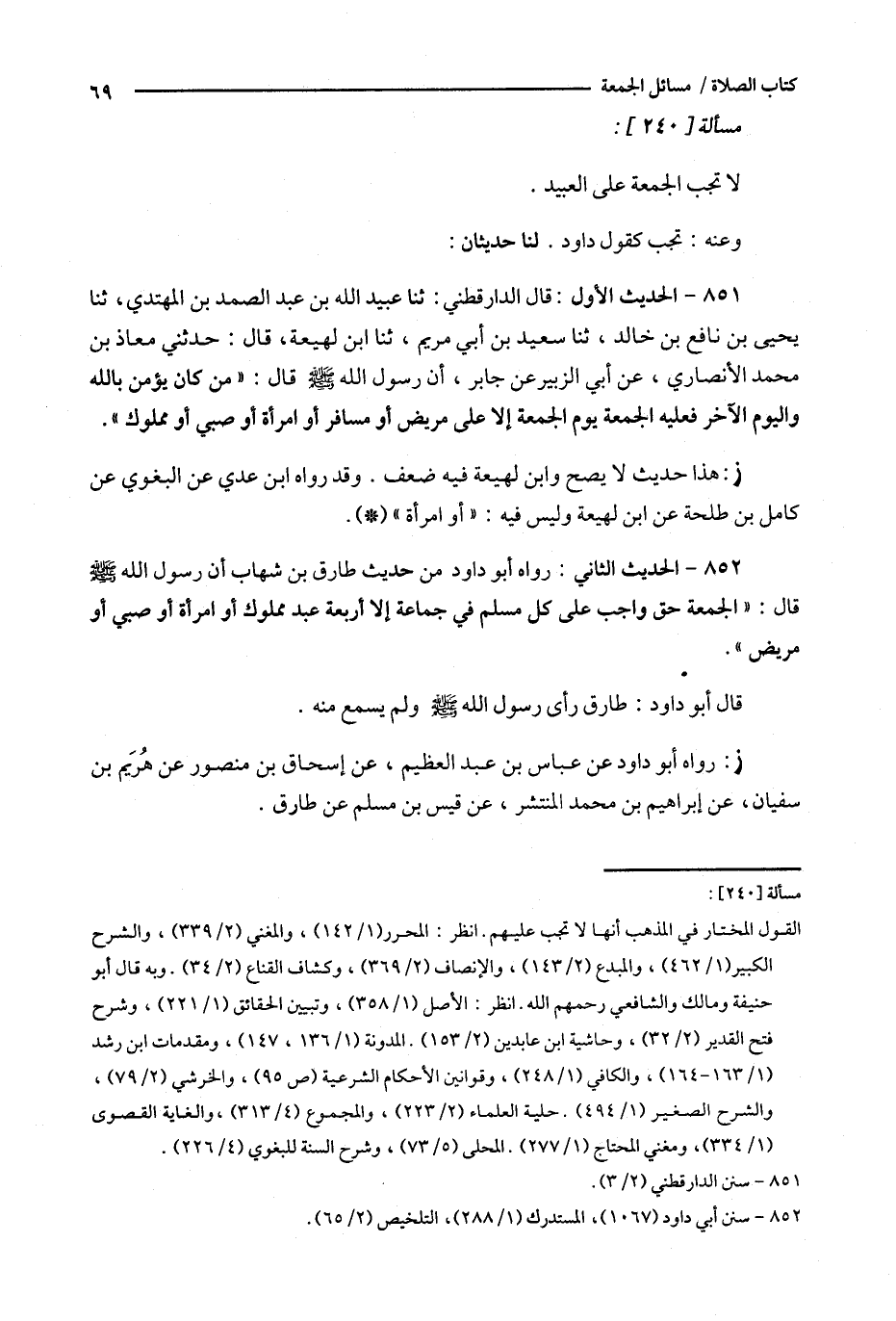 852 - الحديث الثاني : رواه أبو داود من حديث طارق بن شهاب أن رسول الله قال : ' الجمعة حق واجب على كل مسلم في جماعة إلا أربعة عبد مملوك أو امرأة أو صبي أو مريض ' .