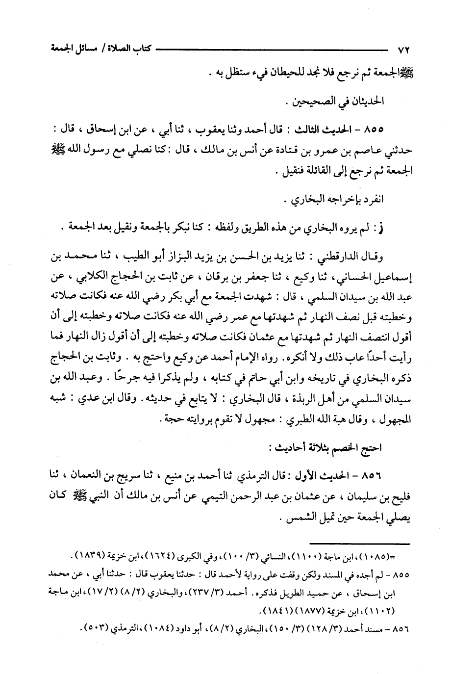 856 - الحديث الأول : قال الترمذي ثنا أحمد بن منيع ، ثنا سريج بن النعمان ، ثنا فليح بن سليمان ، عن عثمان بن عبد الرحمن التيمي عن أنس بن مالك أن النبي كان يصلي الجمعة حين تميل الشمس .
