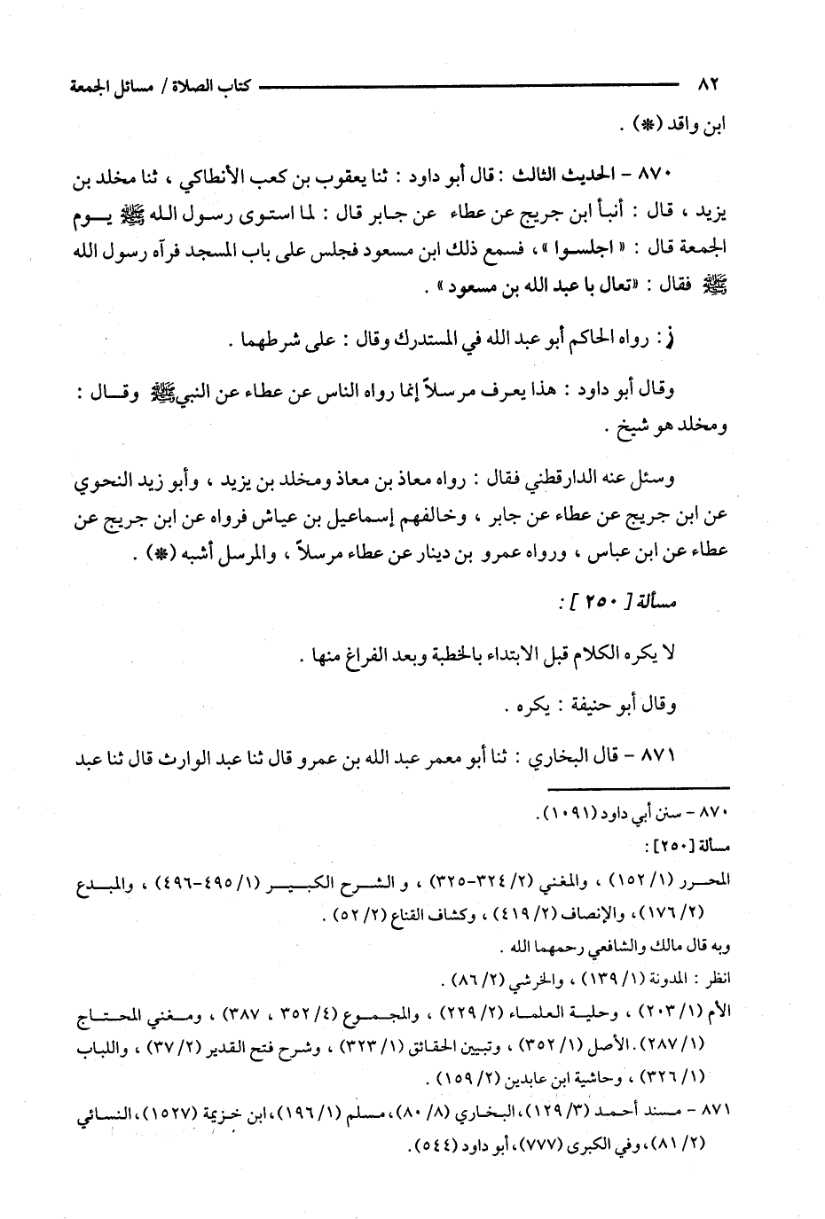 870 - الحديث الثالث : قال أبو داود : ثنا يعقوب بن كعب الأنطاكي ، ثنا مخلد بن يزيد ، قال : أنبأ ابن جريج عن عطاء عن جابر قال : لما استوى رسول الله يوم الجمعة قال : ' اجلسوا ' ، فسمع ذلك ابن مسعود فجلس على باب المسجد فرآه رسول الله فقال : ' تعال با عبد الله بن مسعود ' .