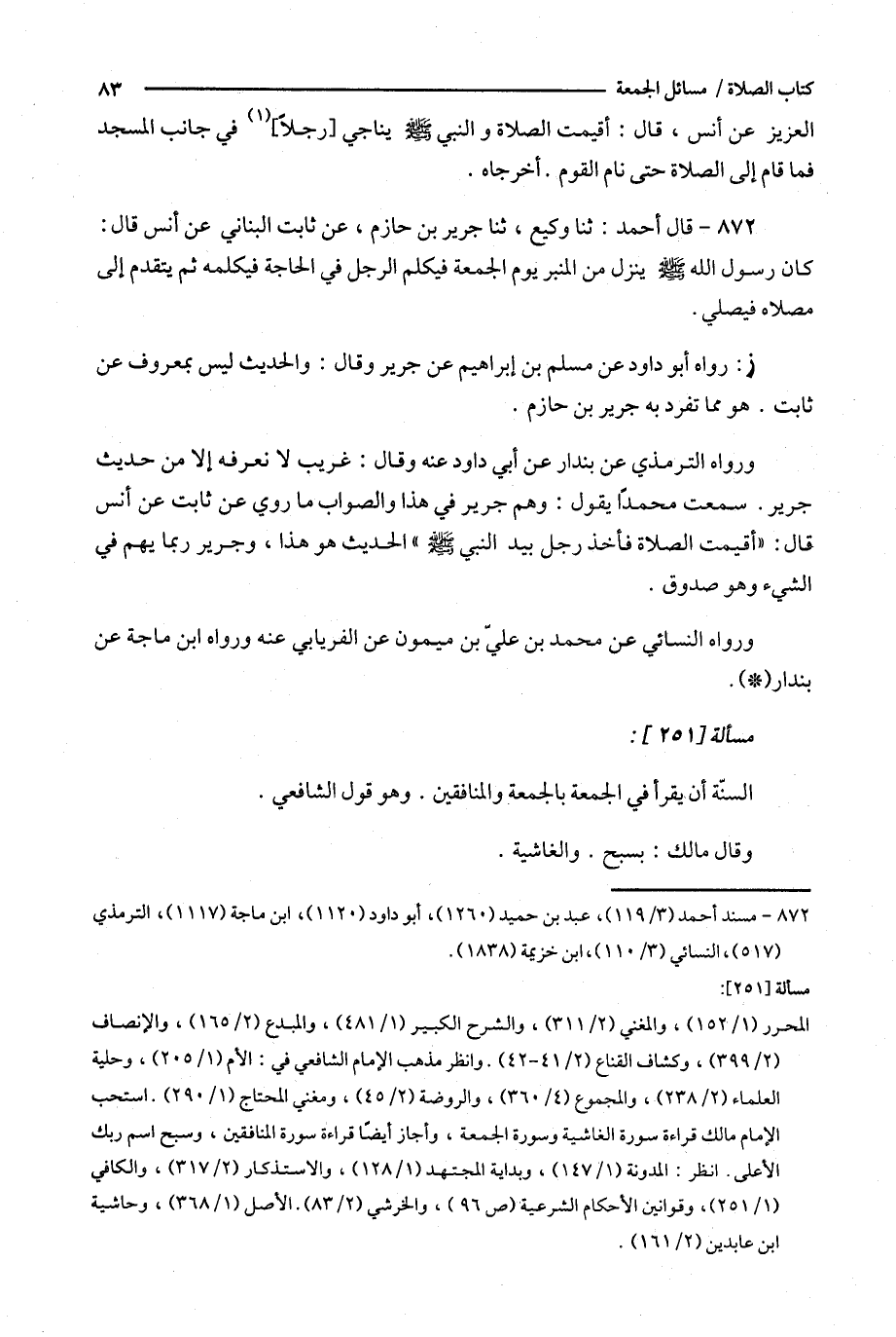 872 - قال أحمد : ثنا وكيع ، ثنا جرير بن حازم ، عن ثابت البناني عن أنس قال : كان رسول الله ينزل من المنبر يوم الجمعة فيكلم الرجل في الحاجة فيكلمه ثم يتقدم إلى مصلاه فيصلي .
