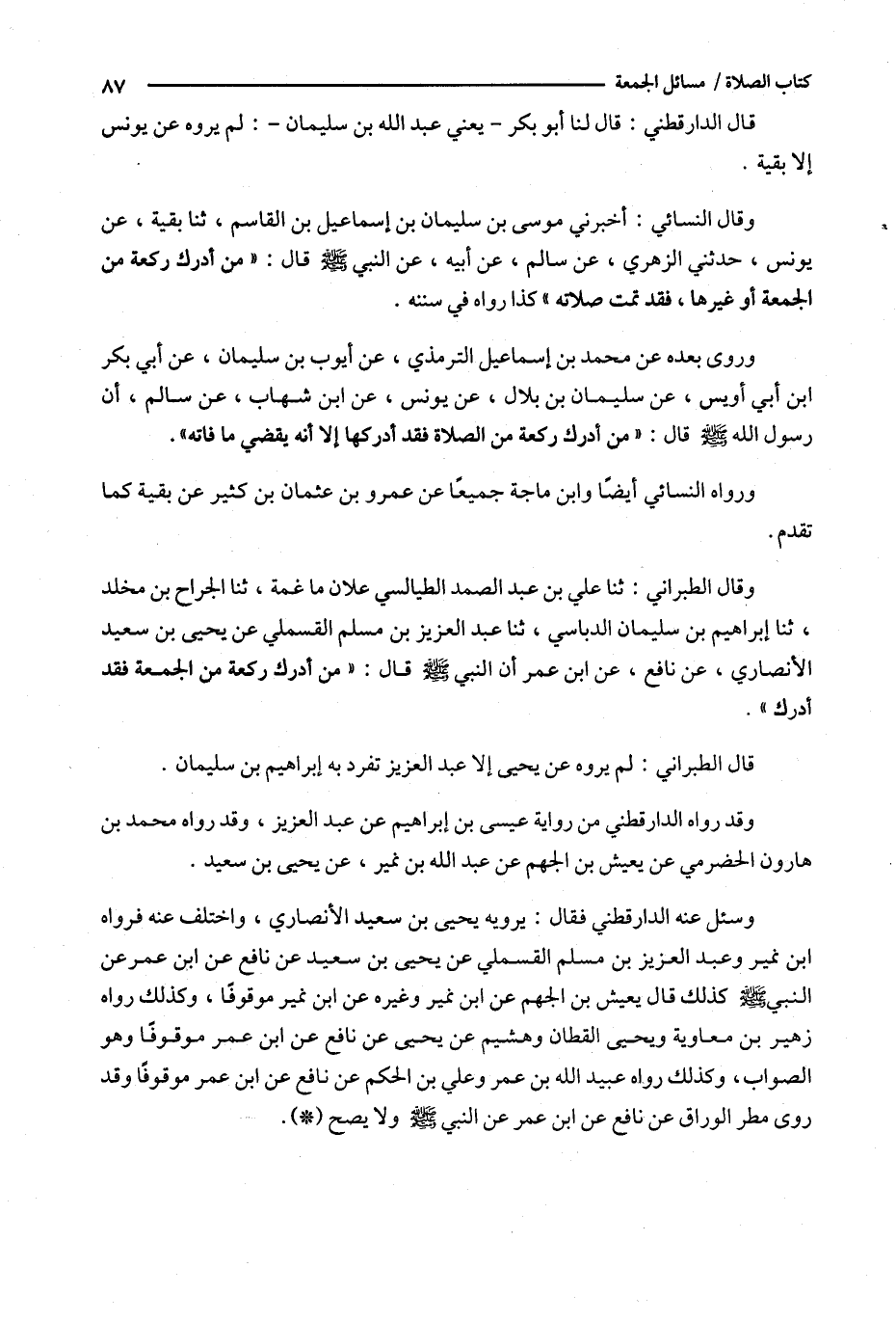وقال الطبراني : ثنا علي بن عبد الصمد الطيالسي علان ما غمة ، ثنا الجراح بن مخلد ، ثنا إبراهيم بن سليمان الدباسي ، ثنا عبد العزيز بن مسلم القسملي عن يحي عن يحي بن سعيد الأنصاري ، عن نافع ، عن ابن عمر أن النبي قال : ' من أدرك ركعة من الجمعة فقد أدرك ' .