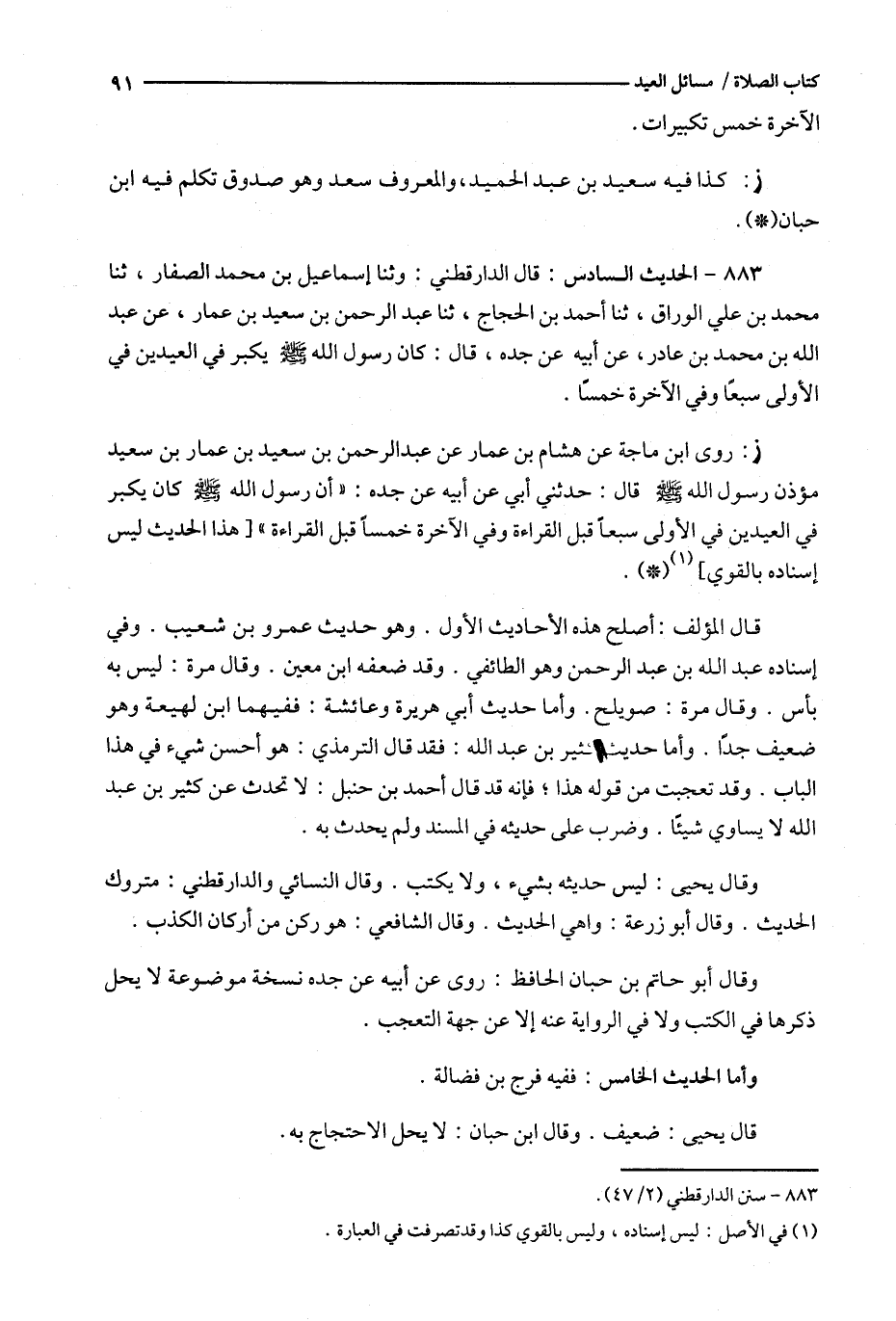 883 - الحديث السادس : قال الدارقطني : وثنا إسماعيل بن محمد الصفار ، ثنا محمد بن علي الوراق ، ثنا أحمد بن الحجاج ، ثنا عبد الرحمن بن سعيد بن عمار ، عن عبد الله بن محمد بن عادر ، عن أبيه عن جده ، قال : كان رسول الله يكبر في العيدين في الأولى سبعا وفي الآخرة خمسا .