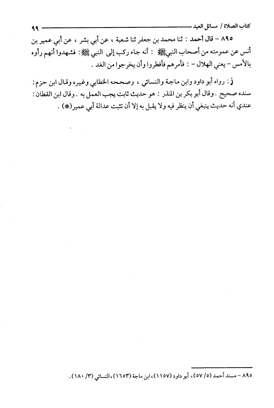 895 - قال أحمد : ثنا حمد بن جعفر ثنا عن شعبة ، عن أبي بشر ، عن أبي عمير بن أنس عن عمومته من أصحاب النبي : أنه جاء ركب إلى النبي : فشهدوا أنهم رأوه بالأمس - يعني الهلال - : فأمرهم فأفطروا وأن يخرجوا من الغد .