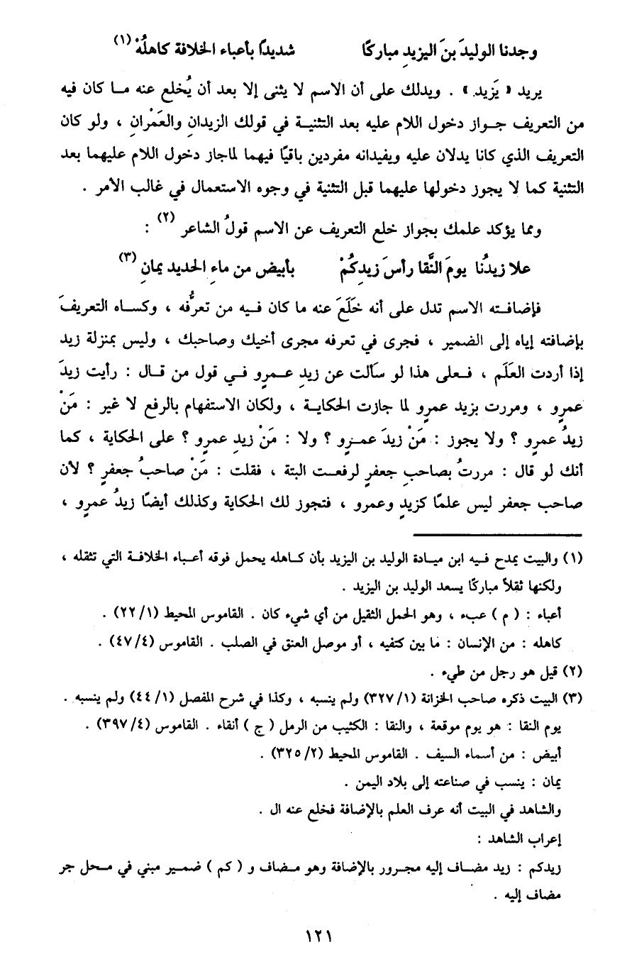 يريد "يزيد". وبذلك على أن الاسم لا يثنى إلا بعد أن يخلع عنه ما كان فيه من التعريف جواز دخول اللام عليه بعد التثنية في قولك: "الزيدان والعمران"، ولو كان التعريف الذي كانا يدلان عليه ويفيدانه مفردين باقيًا فيهما؛ لما جاز دخول اللام عليهما بعد التثنية كما لا يجوز دخولها عليهما قبل التثنية في وجوه الاستعمال في غالب الأمر.