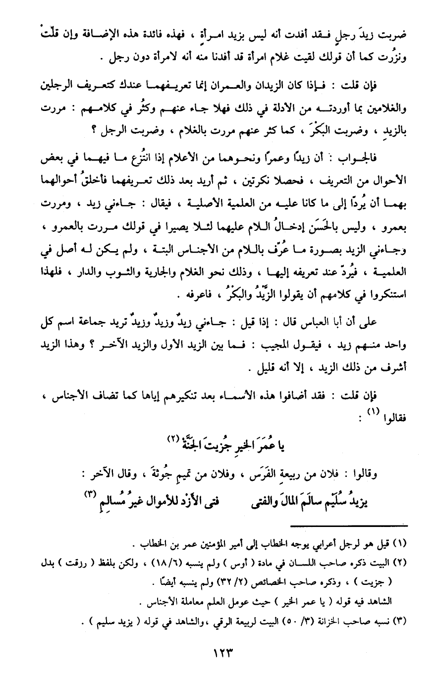 فالجواب: أن زيدًا وعمرًا ونحوهما من الأعلام إذا انتزع ما فيهما في بعض الأحوال من التعريف، فحصلا نكرتين، ثم أريد بعد ذلك تعريفهما؛ فأخلق أحوالهما بهما أن يردا إلى ما كانا عليه من العملية الأصلية؛ فيقال: جاءني زيد، ومررت بعمرو، وليس بالحسن إدخال اللام عليهما؛ لئلا يصيرا في قولك مررت بالعمرو، وجاءني الزيد بصورة ما عرف باللام من الأجناس البتة، ولم يكن له أصل في العلمية؛ فيرد عند تعريفه إليها، وذلك نحو الغلام والجارية والثوب والدار؛ فلهذا استنكروا في كلامهم أن يقولوا الزيد والبكر، فاعرفه.