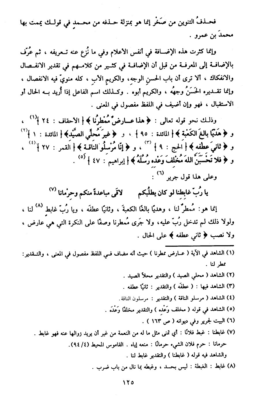 1 الشاهد في الآية "عارض ممطرنا"حيث أنه مضاف في اللفظ مفصول في المعنى، والتقدير: ممطر لنا.