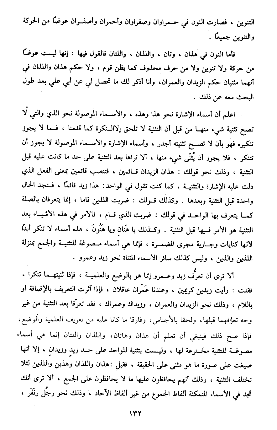 فأما النون في هذان، وتان، واللذان، واللتان فالقول فيها: إنها ليست عوضًا من حركة ولا تنوين ولا من حرف محذوف كما يظن قوم، ولا حكم هذان واللذان في أنهما مثنيان حكم الزيدان والعمران، وأنا أذكر لك ما تحصل لي عن أبي علي بعد طول البحث معه عن ذلك.