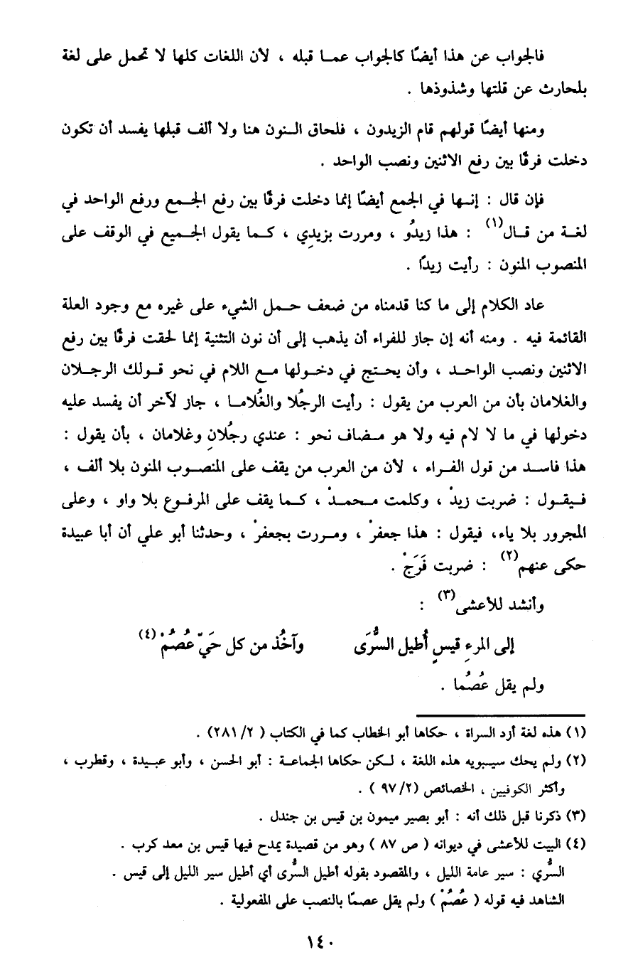 عاد الكلام إلى ما كنا قدمناه من ضعف حمل الشيء على غيره مع وجود العلة القائمة فيه. ومنه أنه إن جاز للفراء أن يذهب إلى أن نون التثنية إنما لحقت فرقا بين رفع الاثنين ونصب الواحد، وأن يحتج في دخولها مع اللام في نحو قولك: الرجلان والغلامان، بأن من العرب من يقول: رأيت الرجلا والغلاما، جاز لآخر أن يفسد عليه دخولها في ما لا لام فيه ولا هو مضاف نحو: عندي رجلان وغلامان، بأن يقول: هذا فاسد من قول الفراء، لأن من العرب من يقف على المنصوب المنون بلا ألف، فيقول: ضربت زيدْ، وكلمت محمدْ، كما يقف على المرفوع بلا واو، وعلى المجرور بلا ياء، فيقول: هذا جعفرْ، ومررت بجعفرْ، وحدثنا أبو علي أن أبا عبيدة حكى عنهم2: ضربت فَرَجْ.