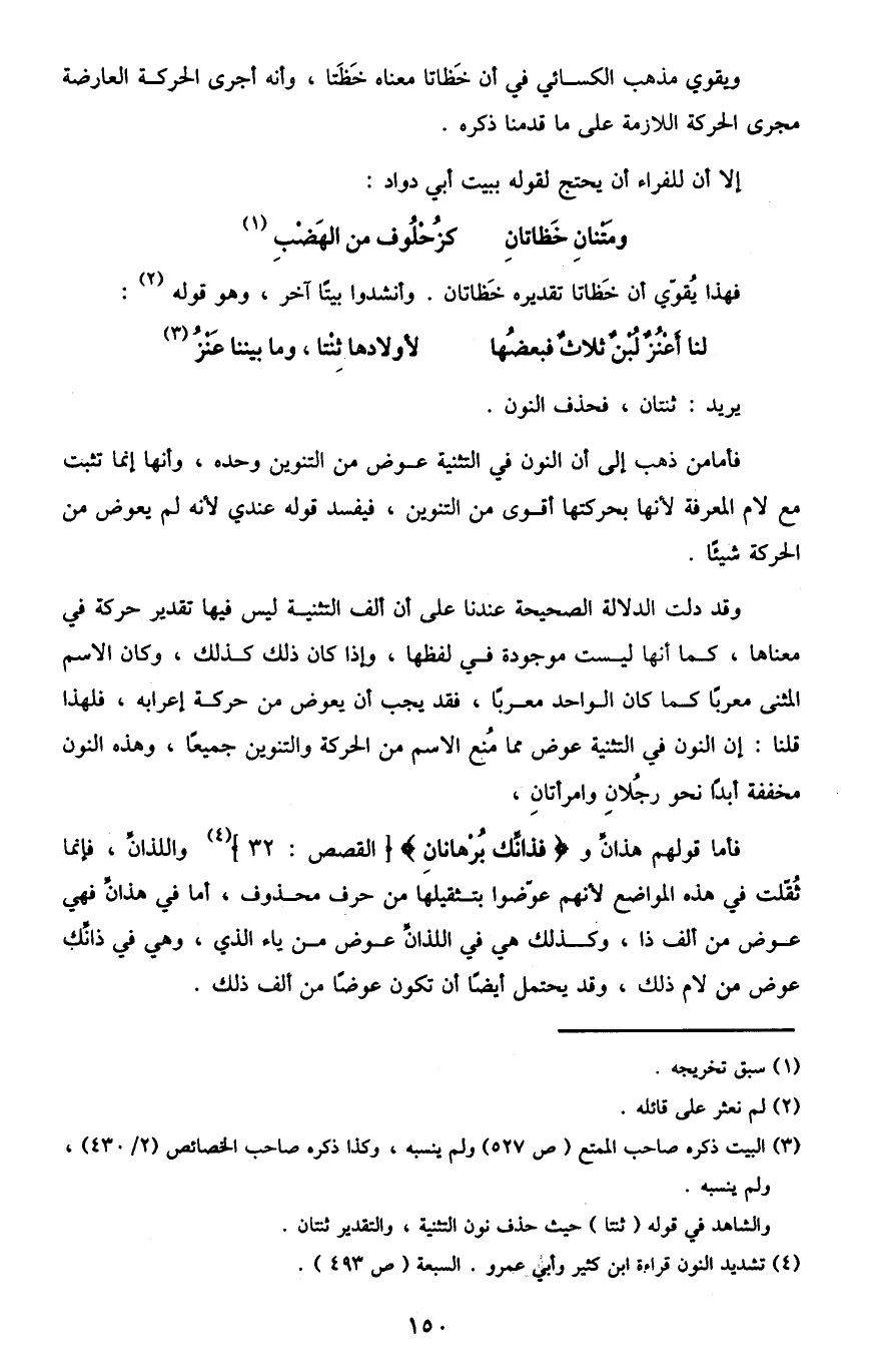 فأما قولهم هذان و {فَذَانِكَ بُرْهَانَانِ} [القصص: 32] 4 واللذان، فإنما ثقلت في هذه المواضع لأنهم عوضوا بثقليها من حرف محذوف، أما في هذان فهي عوض من ألف ذا، وكذلك هي في اللذان عوض من ياء الذي، وهي في ذانك عوض من لام ذلك، وقد يحتمل أيضًا أن تكون عوضًا من ألف ذلك.