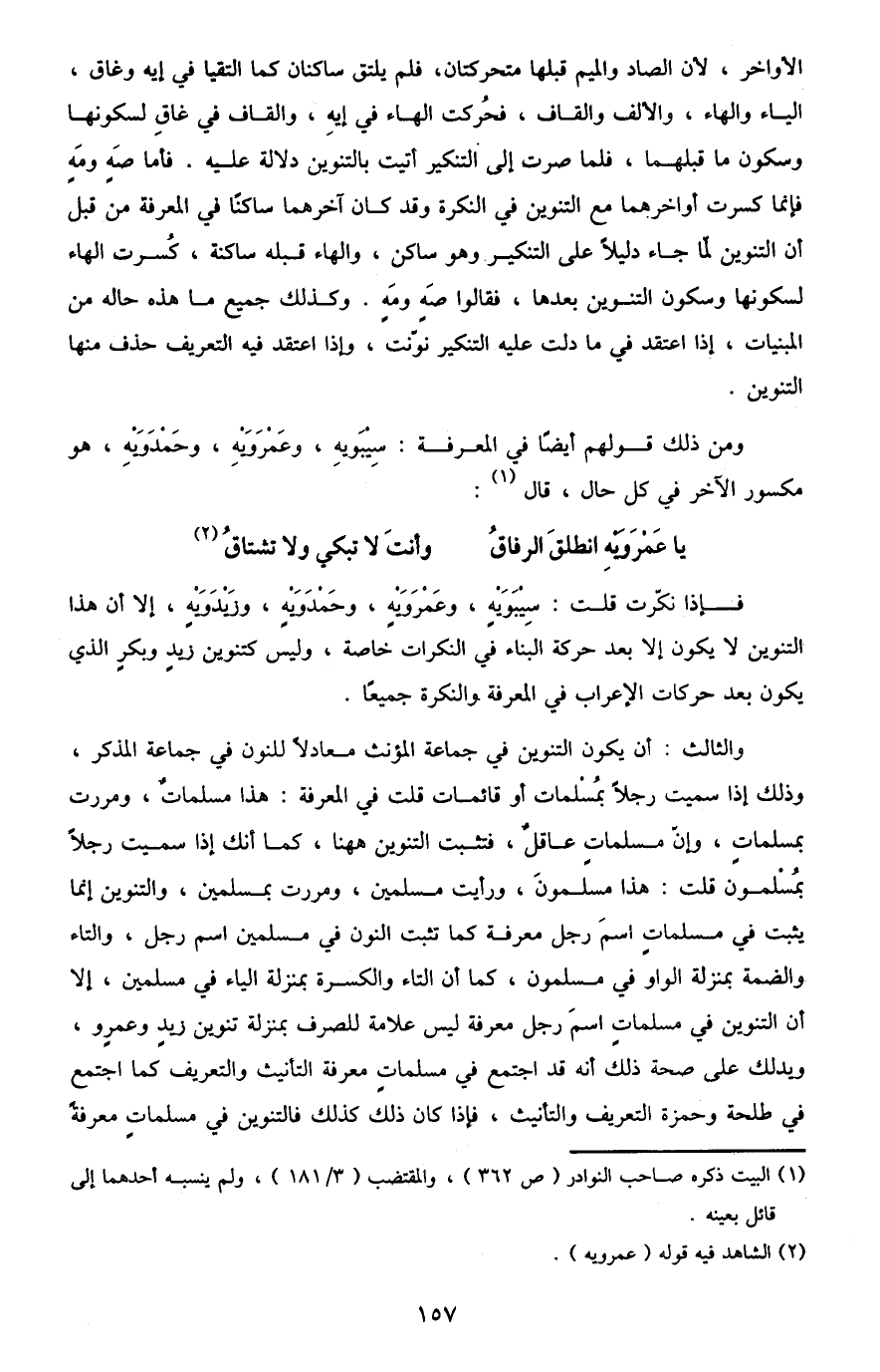 فإذا نكرت قلت: سيبويهٍ، وعمرويهٍ، وحمدويهٍ، وزيدويهٍ، إلا أن هذا التنوين لا يكون إلا بعد حركة البناء في النكرات خاصة، وليس كتنوين زيد وبكر الذي يكون بعد حركات الإعراب في المعرفة والنكرة جميعًا.