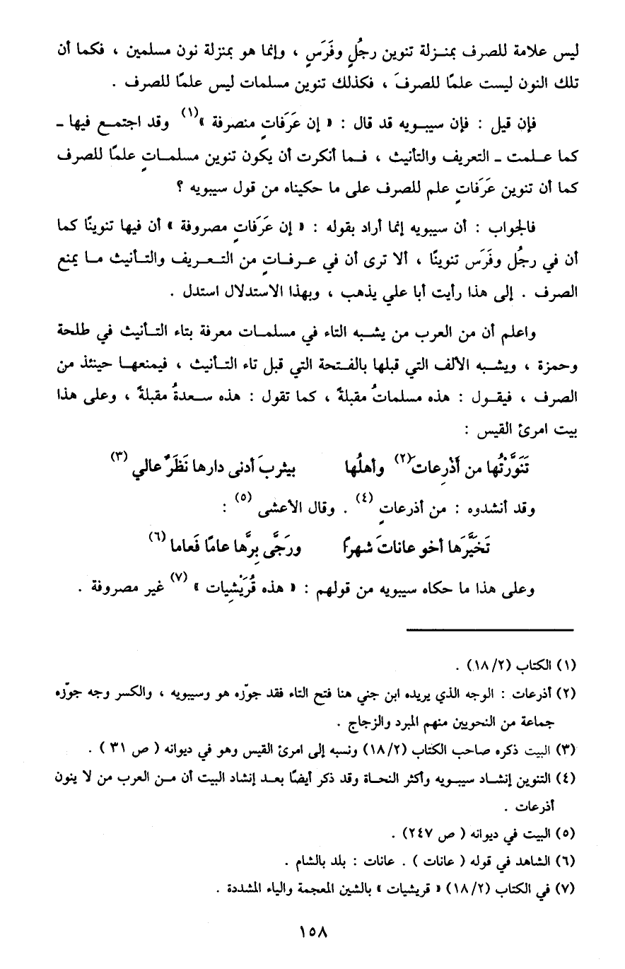 4 التنوين إنشاد سيبويه وأكثر النحاة وقد ذكر أيضًا بعد إنشاد البيت أن من العرب من لا ينون أذرعات.