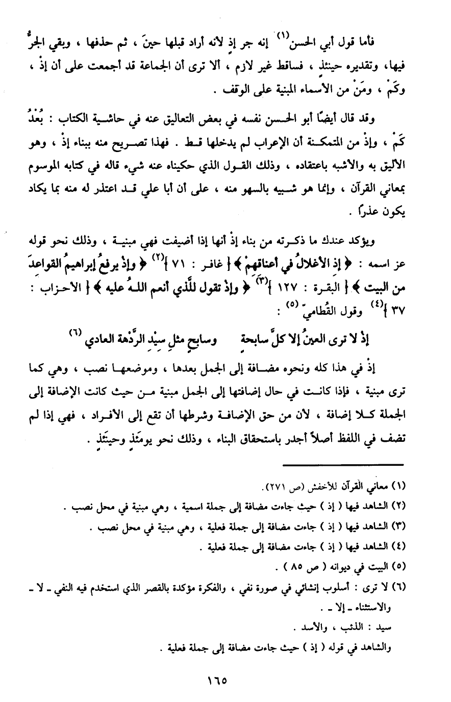 ويؤكد عندك ما ذكرته من بناء إذ أنها إذا أضيفت فهي مبنية، وذلك نحو قوله عَزَّ اسْمُهُ: {إِذِ الأَغْلالُ فِي أَعْنَاقِهِمْ} [غافر: 71] 2 {وَإِذْ يَرْفَعُ إِبْرَاهِيمُ الْقَوَاعِدَ مِنَ الْبَيْتِ} [البقرة: 127] 3 {وَإِذْ تَقُولُ لِلَّذِي أَنْعَمَ اللَّهُ عَلَيْهِ} [الأحزاب: 37] 4 وقول القطامي5: