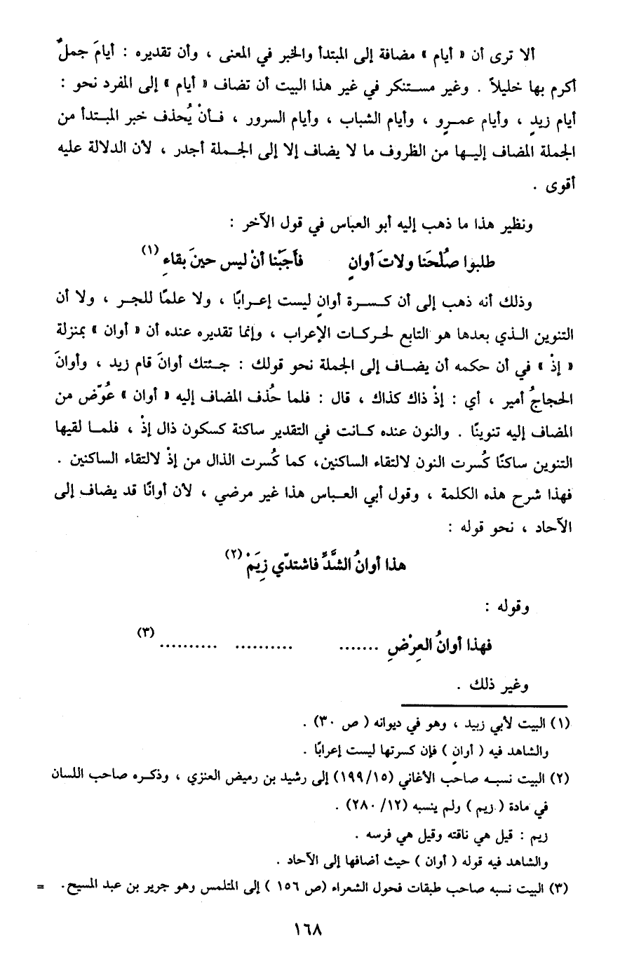 وذلك أنه ذهب إلى أن كسرة أوان ليست إعرابًا، ولا علمًا للجر، ولا أن التنوين الذي بعدها هو التابع لحركات الإعراب، وإنما تقديره عنده أن "أوان" بمنزلة "إذ" في أن حكمه أن يضاف إلى الجملة نحو قولك: جئتك أوانَ قام زيد، وأوانَ الحجاجُ أمير، أي: إذ ذاك كذلك، قال: فلما حذف المضاف إليه "أوانَ" عوض من المضاف إليه تنوينًا. والنون عنده كانت في التقدير ساكنة كسكون ذالِ "إذْ" لالتقاء الساكنين. فهذا شرح هذه الكلمة، وقول أبي العباس هذا غير مرضٍ، لأن أوانًا قد يضاف إلى الآحاد، نحو قوله: