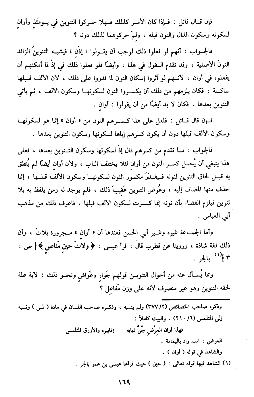 فالجواب: ما تقدم من كسرهم ذال "إذ" لسكونها وسكون التنوين بعدها، فعلى هذا ينبغي أن يحمل كسر النون من "أوانٍ" لئلا يختلف الباب، ولأن "أوانٍ" أيضًا لم ينطق به قبل لحاق التنوين لنونه فيقدر مكسور النون لسكونها وسكون الألف قبلها، إنما حذف منها المضاف إليه، وعوض التنوين عقيب ذلك، فلم يوجد له زمن يلفظ به بلا تنوين فيلزم القضاء بأن نونه إنما كسرت لسكون الألف قبلها، فاعرف ذلك من مذهب أبي العباس.