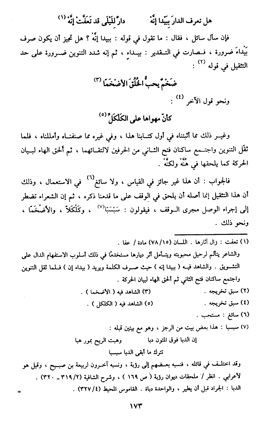فالجواب: أن هذا غير جائز في القياس، ولا سائغ6 في الاستعمال، وذلك أن هذا التثقيل إنما أصله أن يلحق في الوقف على ما قدمنا ذكره، ثم إن الشعراء تضطر إلى إجراء الوصل مجرى الوقف، فيقولون: سَبْسَبَا7، وكَلْكَلَا، والأَضْخَمَا، ونحو ذلك.