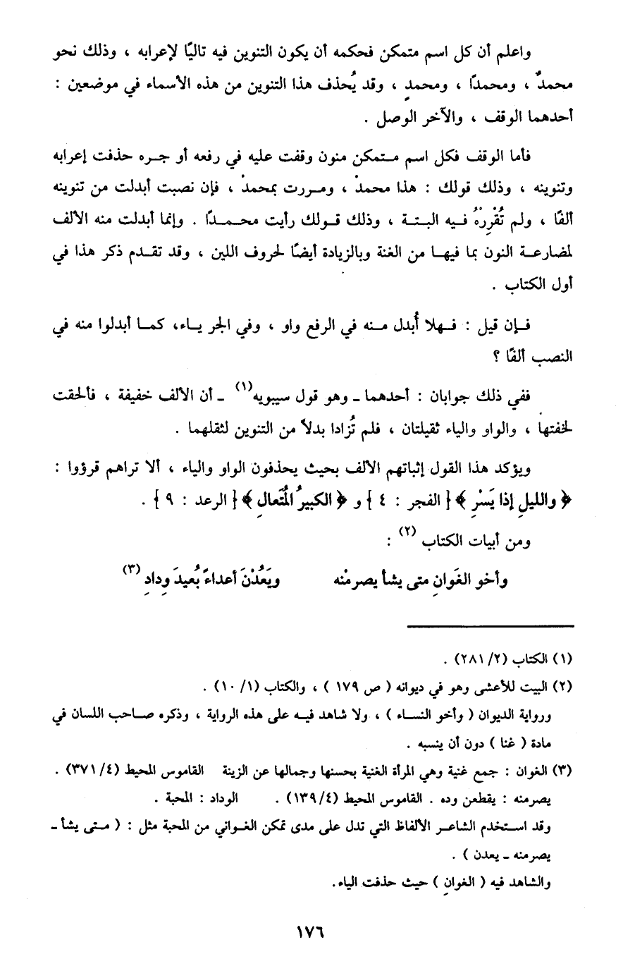 واعلم أن كل اسم متمكن فحكمه أن يكون التنوين فيه تاليًا لإعرابه، وذلك نحو محمدٌ، ومحمدًا، ومحمدٍ، وقد يحذف هذا التنوين من هذه الأسماء في موضعين: أحدهما الوقف، والآخر الوصل.
