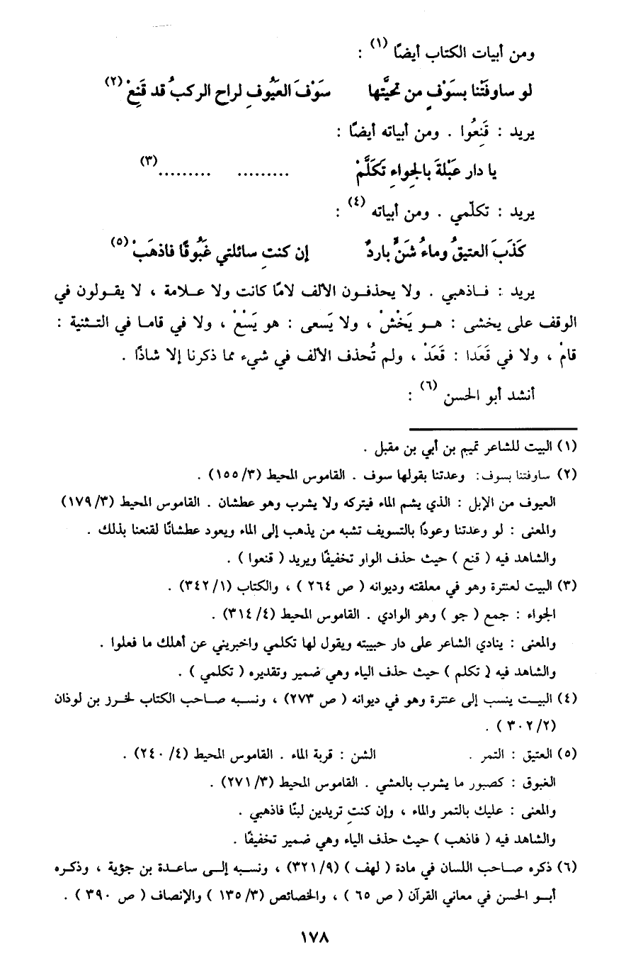 4 البيت ينسب إلى عنترة وهو في ديوانه "ص273"، ونسبه صاحب الكتاب لخرز بن لوذان "2/ 302".