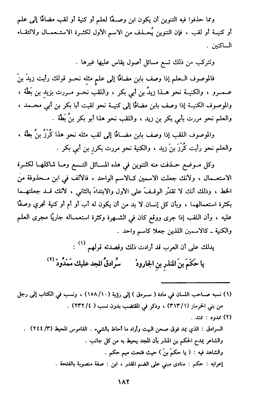 ومما حذفوا فيه التنوين أن يكون "ابن" وصفًا لعلم أو كنية أو لقب مضافًا إلى علم أو كنية أو لقب، فإن التنوين يحذف من الاسم الأول لكثرة الاستعمال ولالتقاء الساكنين.