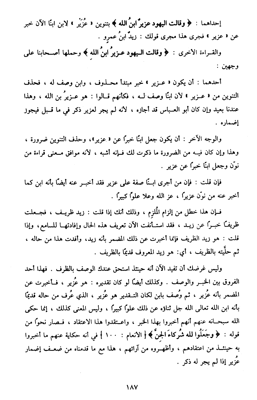 فإن قلت: فإن من أجرى ابنا صفة على عزير فقد أخبر عنه أيضا بأنه ابن كما أخبر عنه من نون عزيرًا، عزَّ اللهُ وعلا علوًّا كبيرًا.