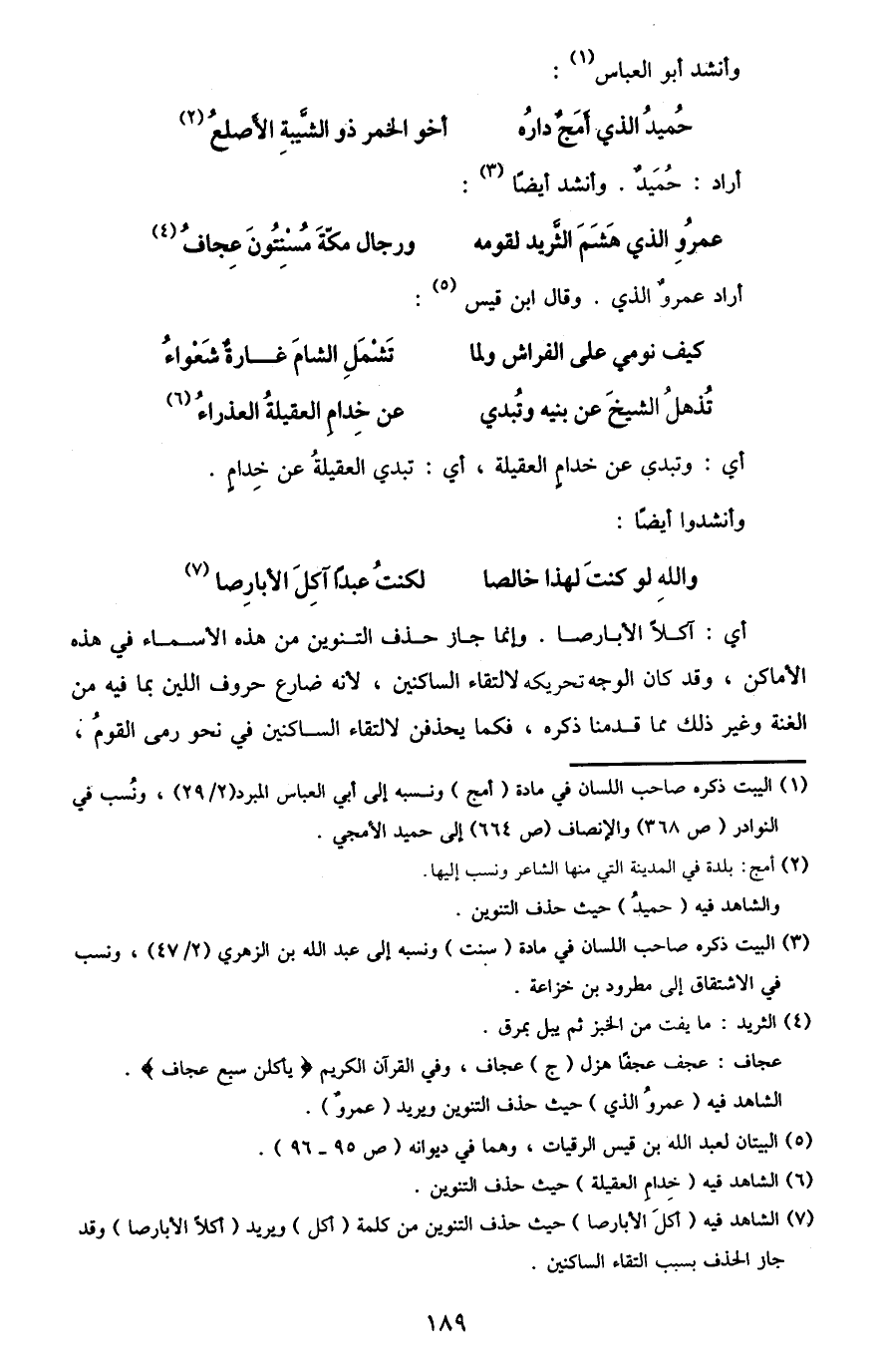 7 الشاهد فيه "أَكْلَ الأبارصا" حيث حذف التنوين من كلمة "أكل" ويريد "أَكْلا الأبارصا" وقد جاز الحذف بسبب التقاء الساكنين.