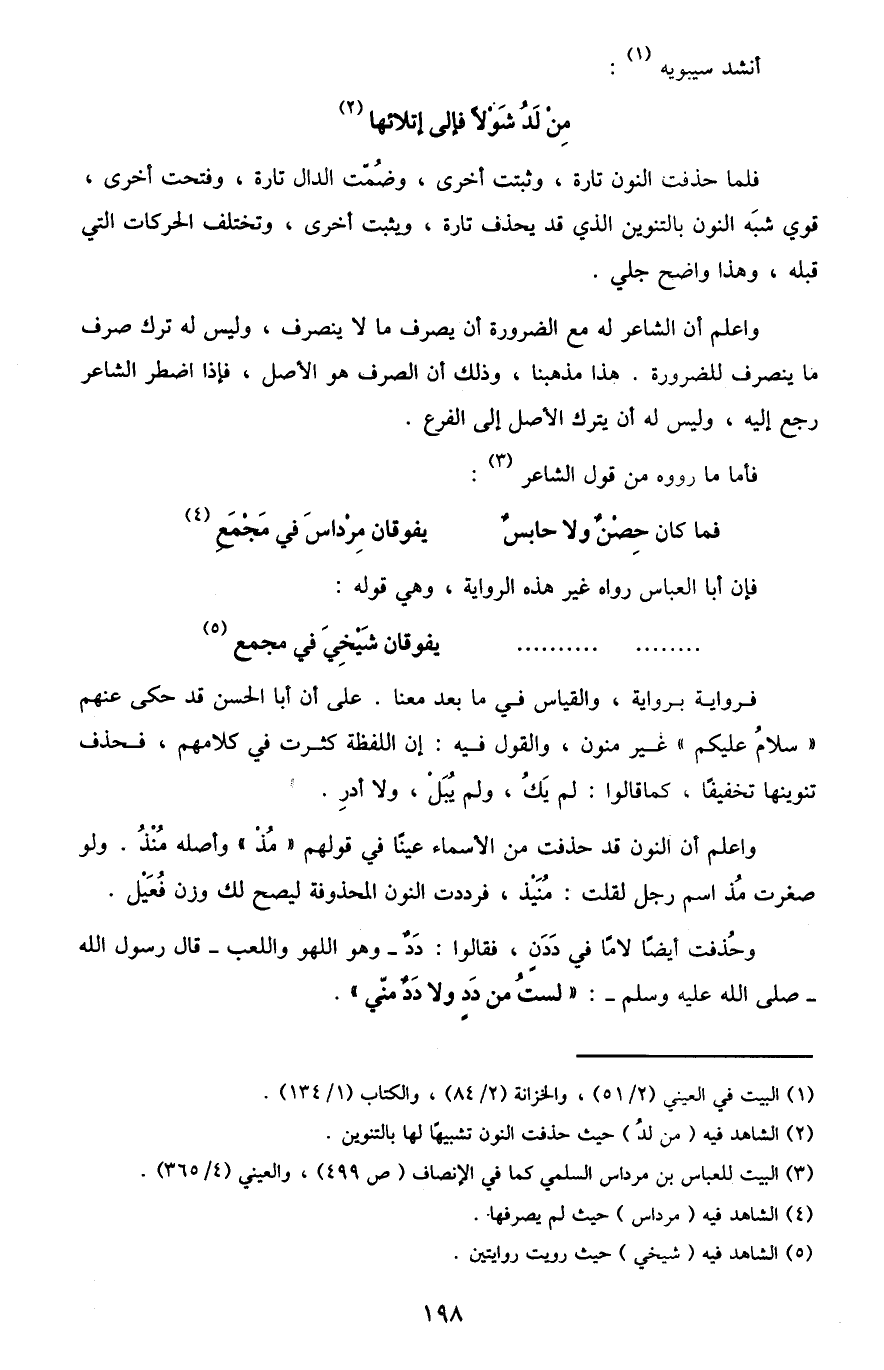واعلم أن الشاعر له مع الضرورة أن يصرف ما لا ينصرف، وليس له ترك صرف ما ينصرف للضرورة. هذا مذهبنا، وذلك أن الصرف هو الأصل، فإذا اضطر الشاعر رجع إليه، وليس له أن يترك الأصل إلى الفرع.